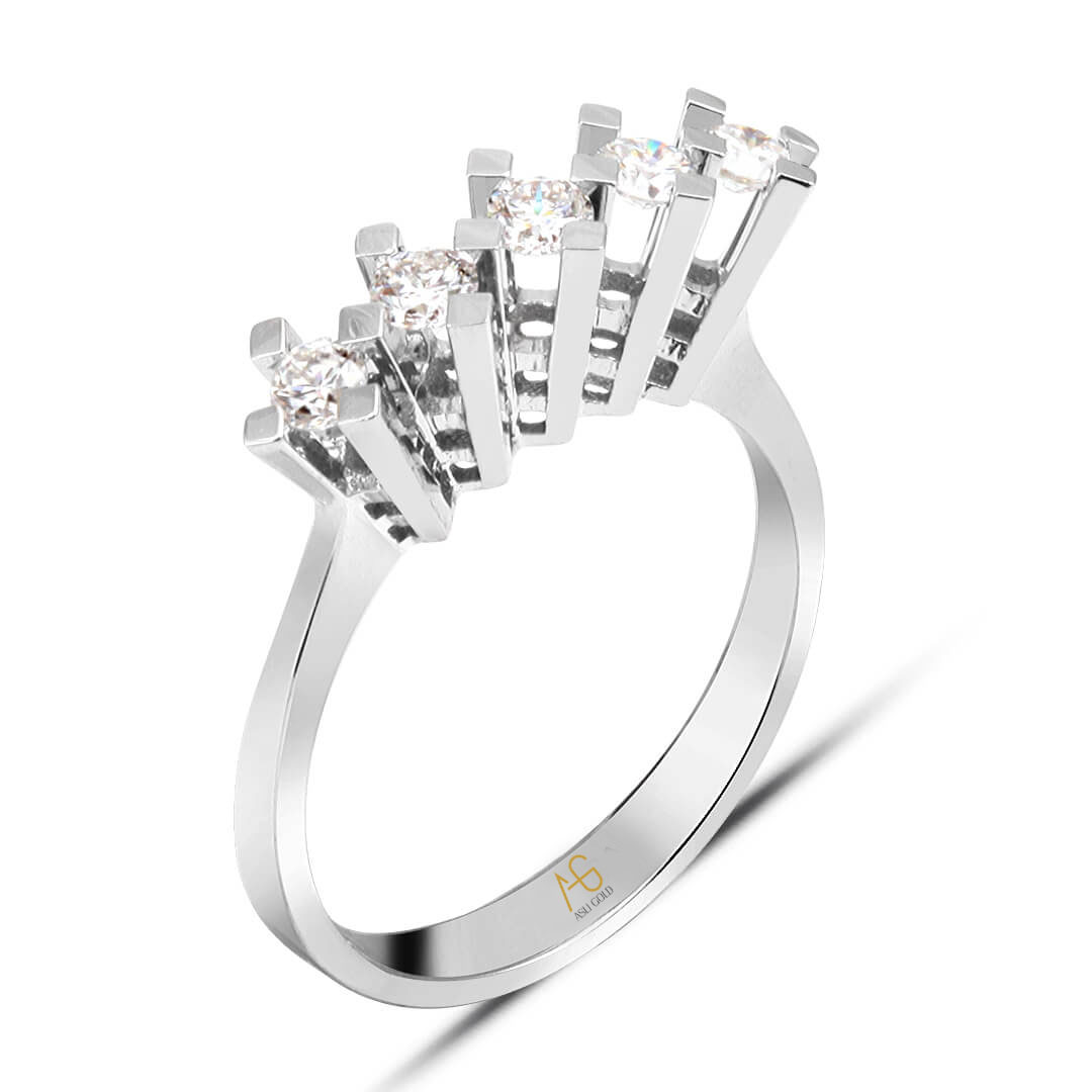 Işıltısıyla kadınların cazibesini her daim yansıtan parmaklardan hiç ayrılmayan pırlanta beş taş yüzük. 14 Ayar beyaz altın üzerine F-SI kalite pırlantalar mıhlanarak tasarlanmış modelin gram ağılığı 3.35 gramdır.