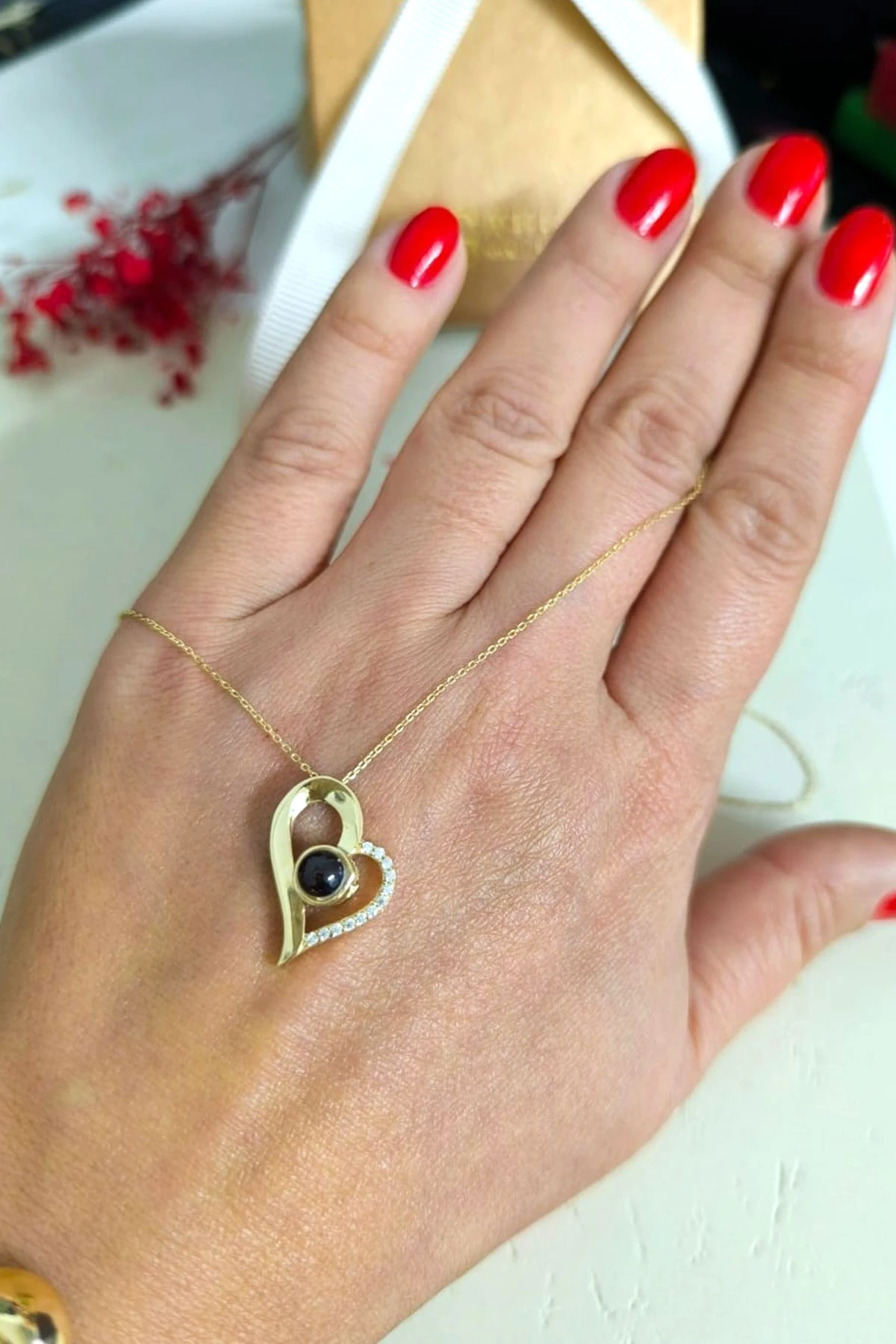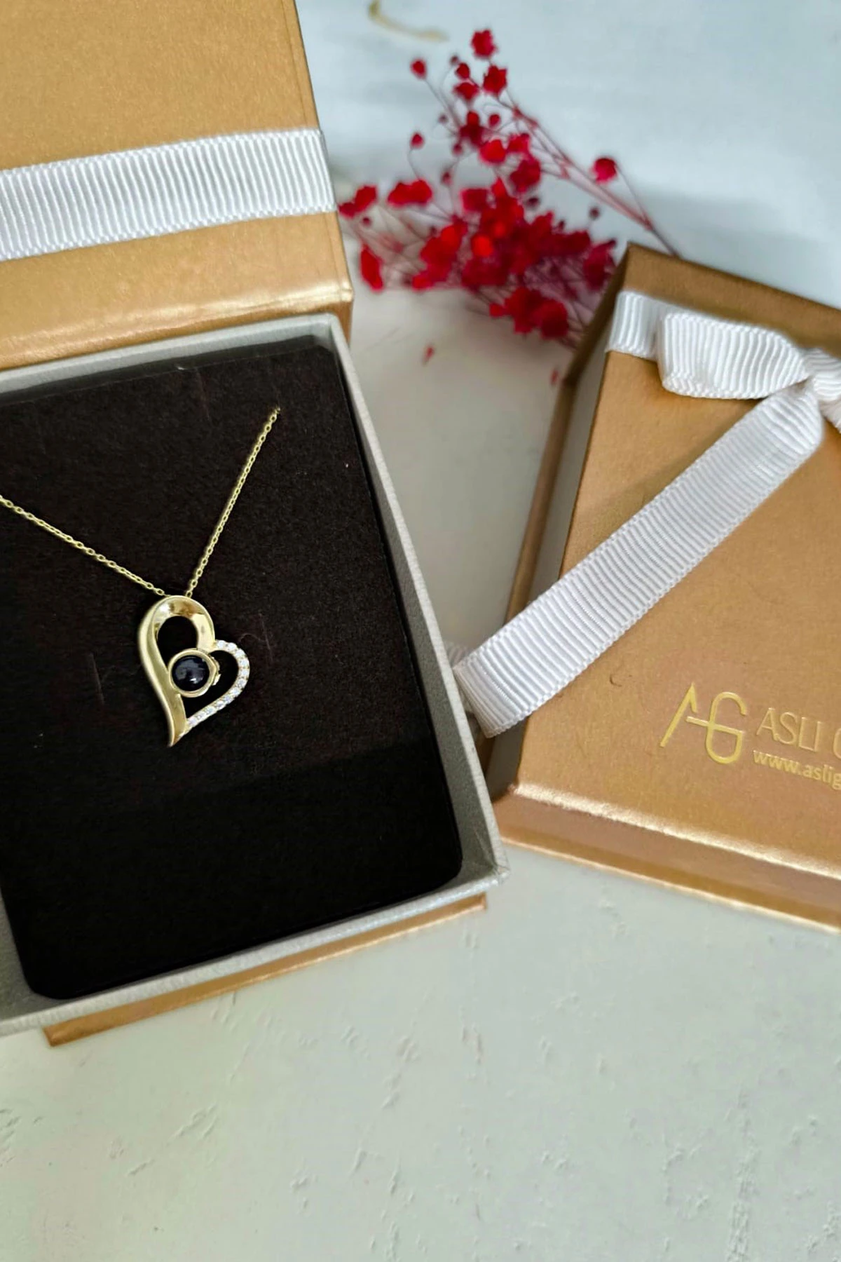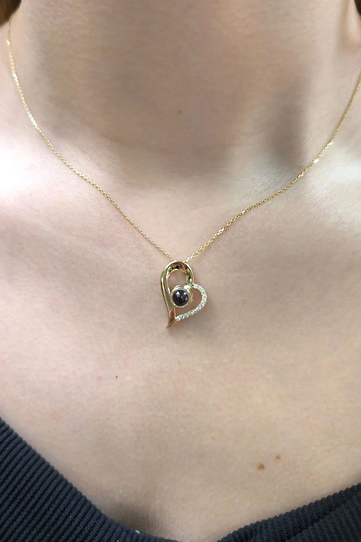 14 Ayar 3.10 gram ağırlığında 45 cm kendinden zincirli ortadaki koyu renkli taş içerisinde 100 dilde seni seviyorum yazılı estetik kalp tasarımlı anlam dolu altın kolye.