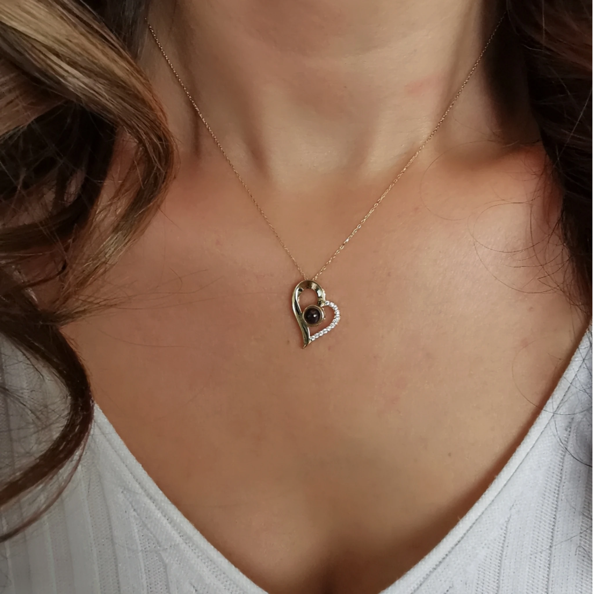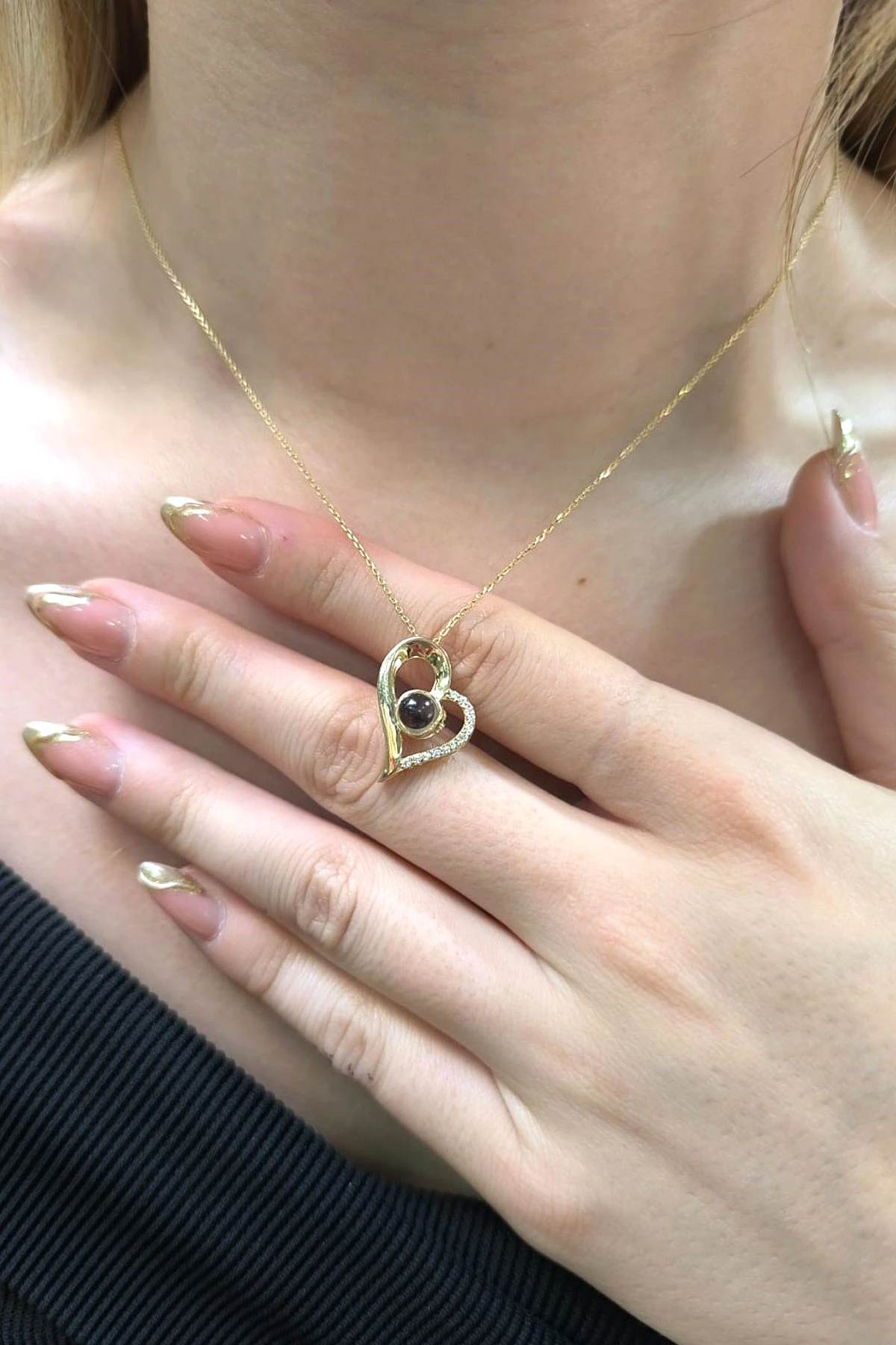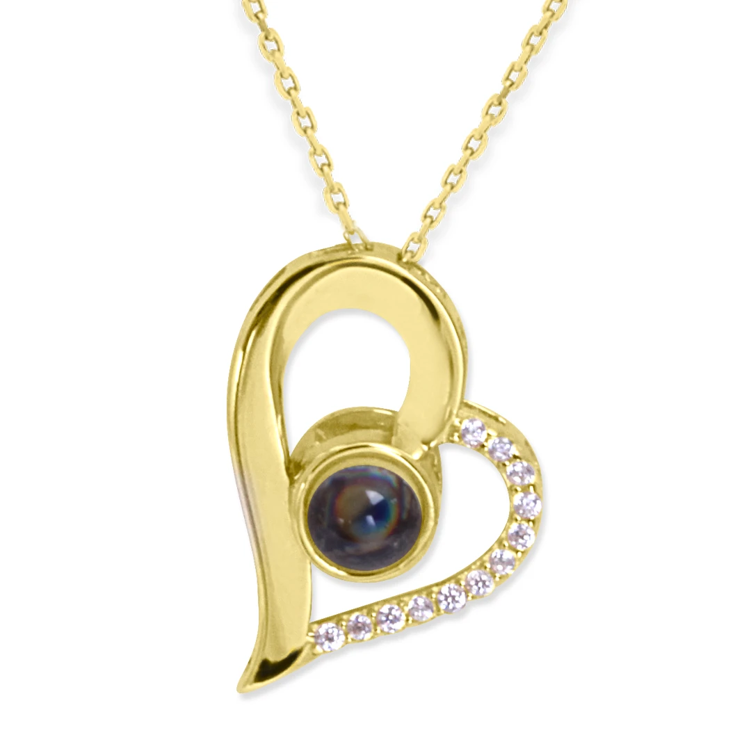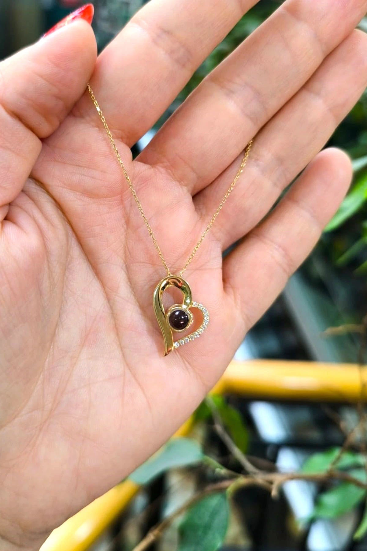 14 Ayar 3.10 gram ağırlığında 45 cm kendinden zincirli ortadaki koyu renkli taş içerisinde 100 dilde seni seviyorum yazılı estetik kalp tasarımlı anlam dolu altın kolye.