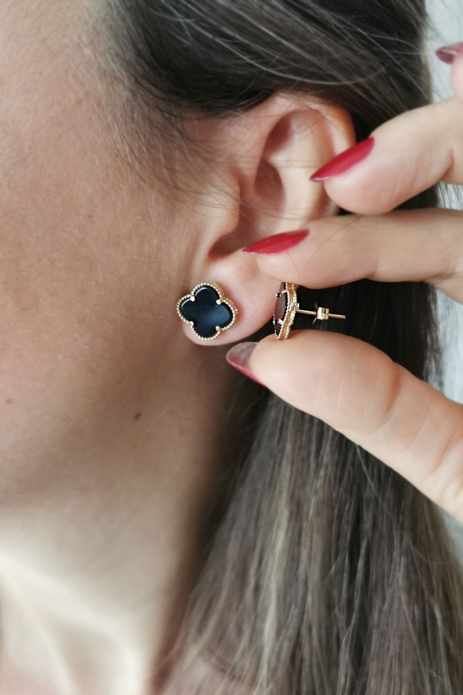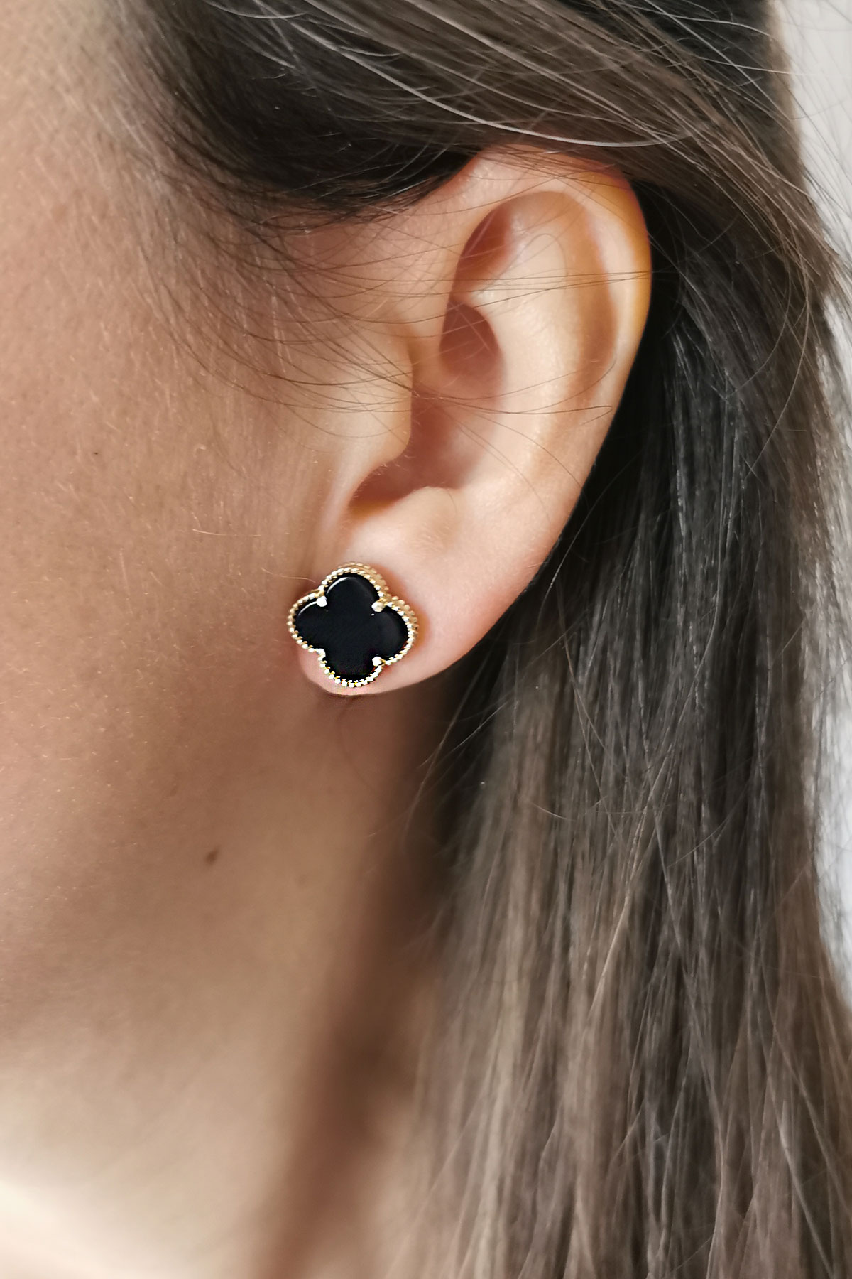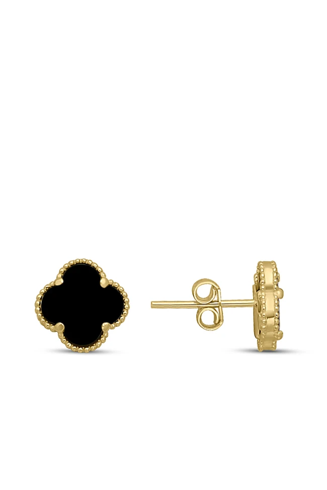 14 Ayar taş boyu 1.2 Cm modern tasarımı ile şık duruşa da sahip günlük kullanıma uygun 2.90 gram ağırlığında tasarım onix siyah taşlı vidalı altın yonca küpe.