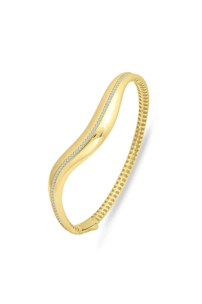14 Ayar şık estetik modeliyle oldukça zarif ve aynı zamanda havalı duruşa sahip 8.60 gram ağırlığında dalga S model altın taşlı kadın bilezik.