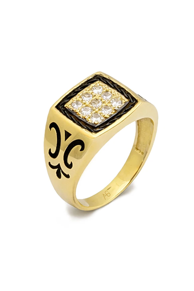 Güç bazen sessizdir… ama varlığı her ortamda hissedilir. Bu özel tasarım altın erkek yüzük, geometrik formu ve ışıltılı taş detaylarıyla kararlılığı ve özgüveni simgeliyor. Üst kısmındaki üçgen bölümlere yerleştirilen parlak taşlar ışığı her açıdan yakalayarak dikkat çekerken, yan yüzeydeki siyah motif detayı modele güçlü ve karakterli bir duruş katıyor.