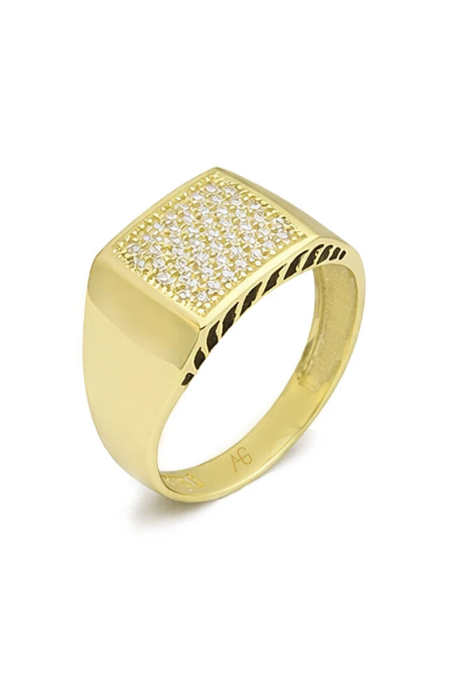 Gücünü sadelikten alan ama etkisini ışıltısıyla gösteren bir tasarım… Bu altın erkek yüzük, kare formunun modern çizgisi ve yüzeyi tamamen kaplayan taş detaylarıyla kararlı bir duruş sergiler. Işıkla buluştuğunda ortaya çıkan parıltı, abartıdan uzak ama iddialı bir stil sunar. Yan kısımdaki özel desen dokunuşu ise modele karakter katar; klasik bir yüzükten çok daha fazlasını hissettirir.