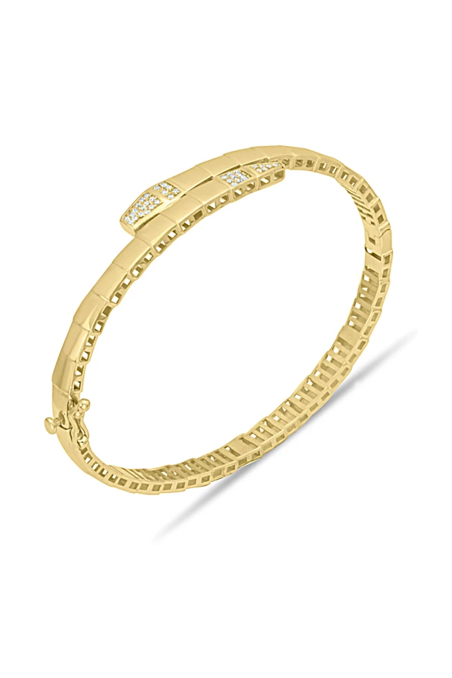 14 Ayar şık estetik modeliyle oldukça zarif ve aynı zamanda havalı duruşa sahip 9.60 gram ağırlığında zirkon taş detaylı italyan yılanlı model altın kadın bilezik.