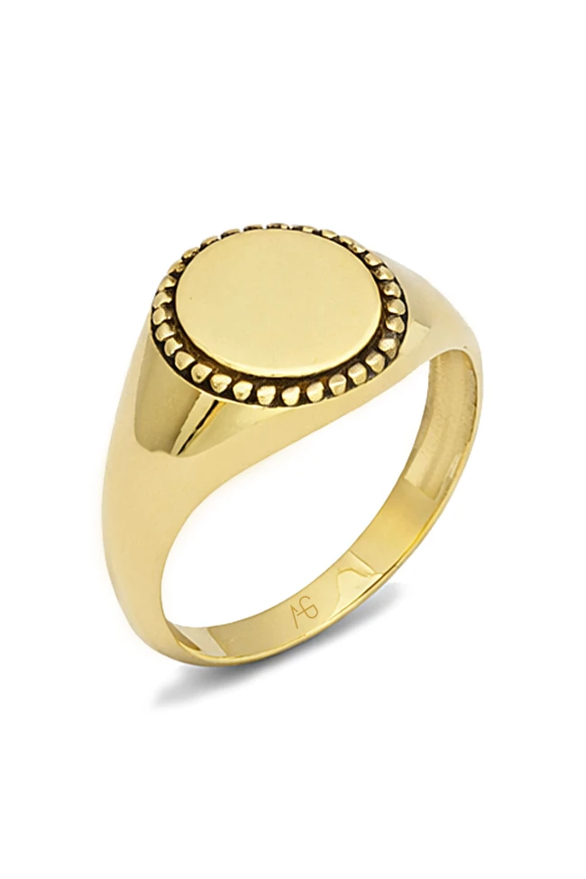 Zarafeti detaylarda saklı olan bu altın erkek yüzük, güçlü ve zamansız bir stilin simgesi olarak tasarlandı. Üst kısmındaki sade ve parlak oval yüzey, çevresini saran ince işçilikli detaylarla birleşerek klasik bir imza yüzük karakteri taşır. Gösterişten uzak ama etkileyici duruşu sayesinde hem günlük kombinlerde hem de özel davetlerde rahatlıkla kullanılabilir.