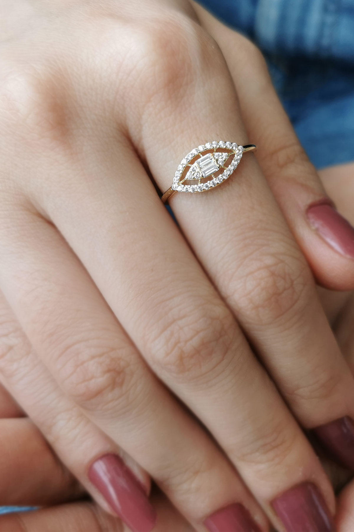 14 ayar sarı altın baget tasarımıyla günlük kullanıma uygun parmağınızda stilinize hava katacak 1.40 gram ağırlığında zirkon taşlı göz yüzük.