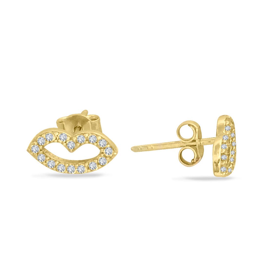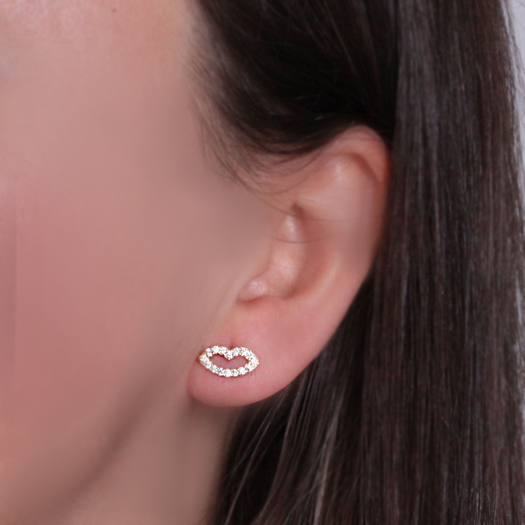 14 Ayar zirkon taş detaylı ışıl ışıl ve sempatik duruşa sahip günlük kullanıma uygun 1.65 gram ağırlığında spor mini dudak figürlü altın küpe.