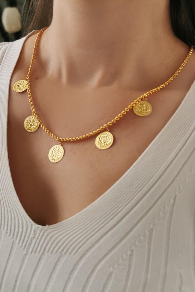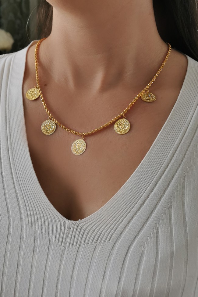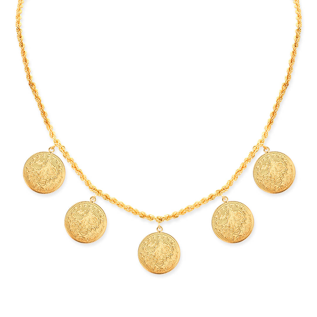 14 Ayar 1.5 cm boyutunda beşi bir yerde halat zincir üzerine el işçiliği ile özenle üretilmiş 7.8 gr. ağırlığında altın tuğralı gerdanlık, kolye.