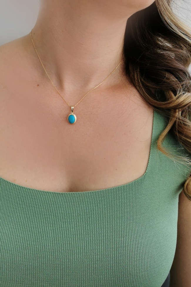 Turkuaz mavi firuze taşlı nostalji zarif tasarımları sevenlere özel altın günlük kullanıma uygun kolye. Model boyutu tepeliği dahil 2 cm olup 45cm zincirli olarak 2.30 gram ağırlığındadır.