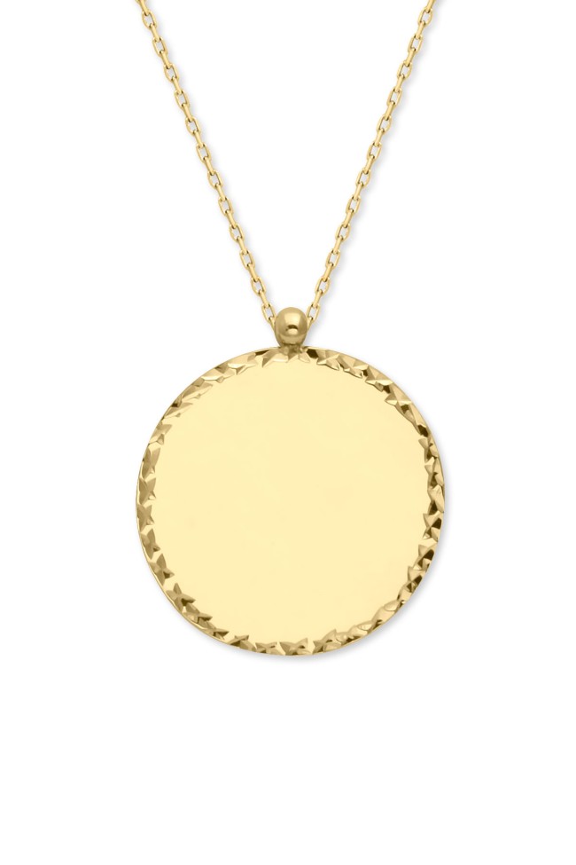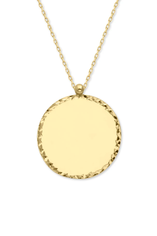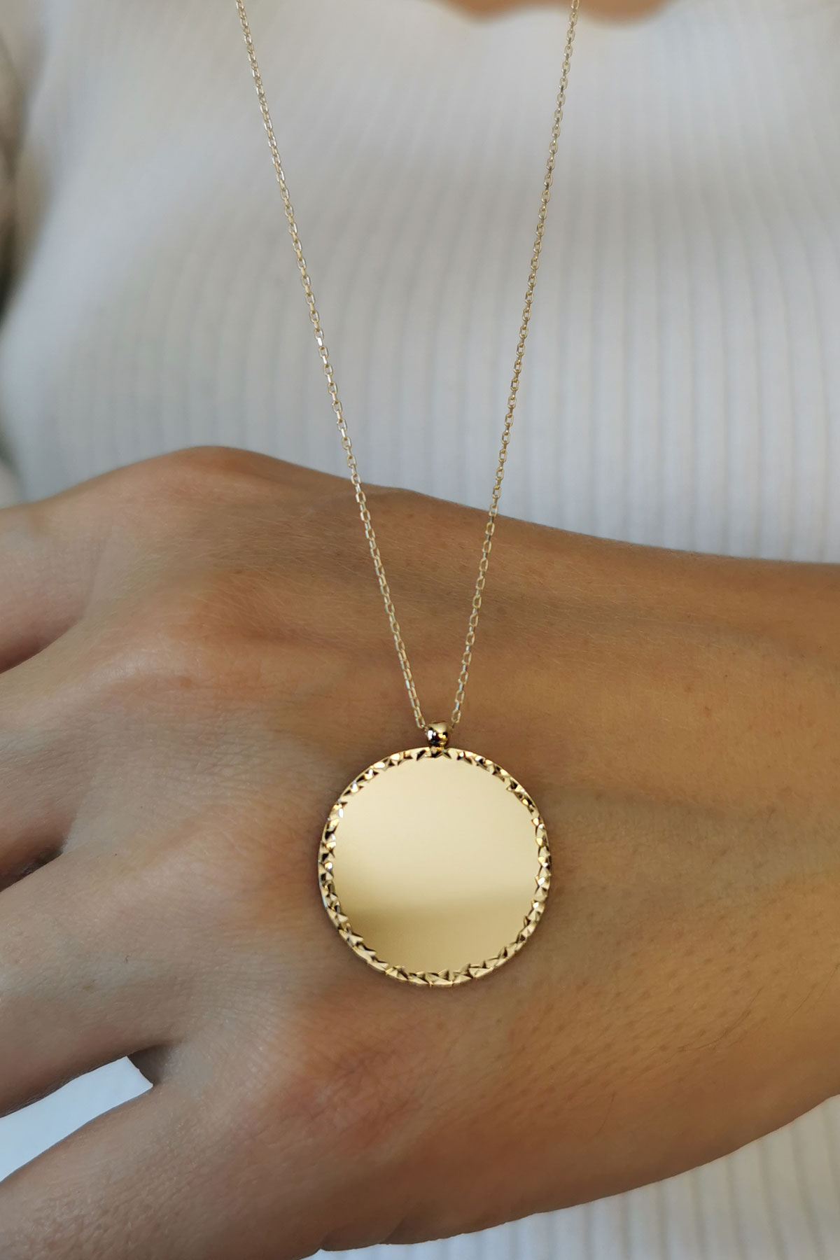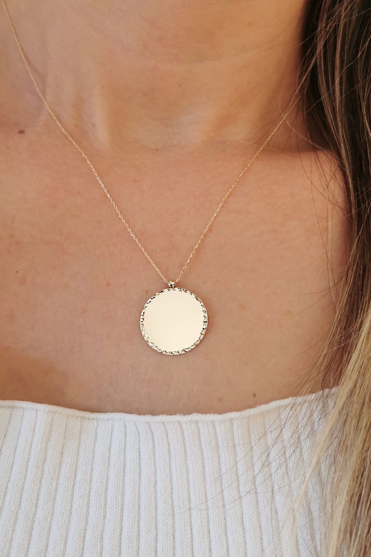 2 Cm boyutunda kenar kısmı kalem işlemeli yuvarlak plaka kolye ile ışıltınıza ve günlük stilinize renk katacak, farklı kolyelerinizle kombin olarak kullanmaya bayılacaksınız.