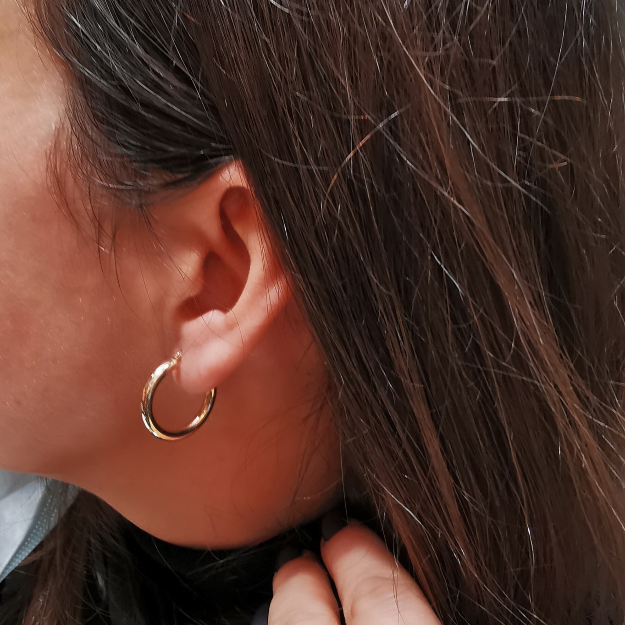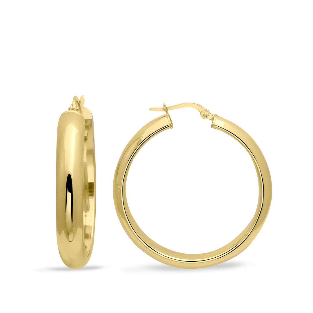 14 Ayar sarı altın her sezonun modası olan ışıl ışıl duruşa sahip düz bombe detaylı günlük kullanıma uygun 1.60 gram ağırlığında 2 Cm boyunda dolgun altın halka küpe.