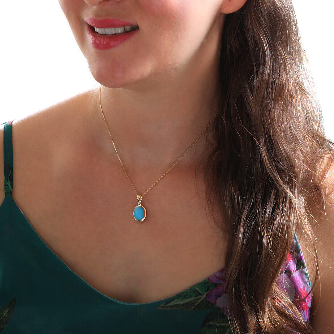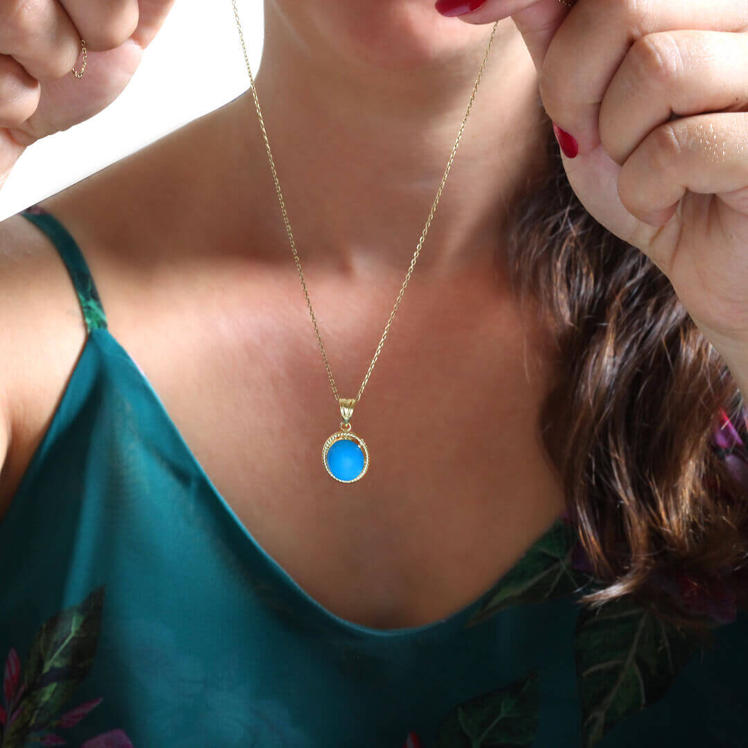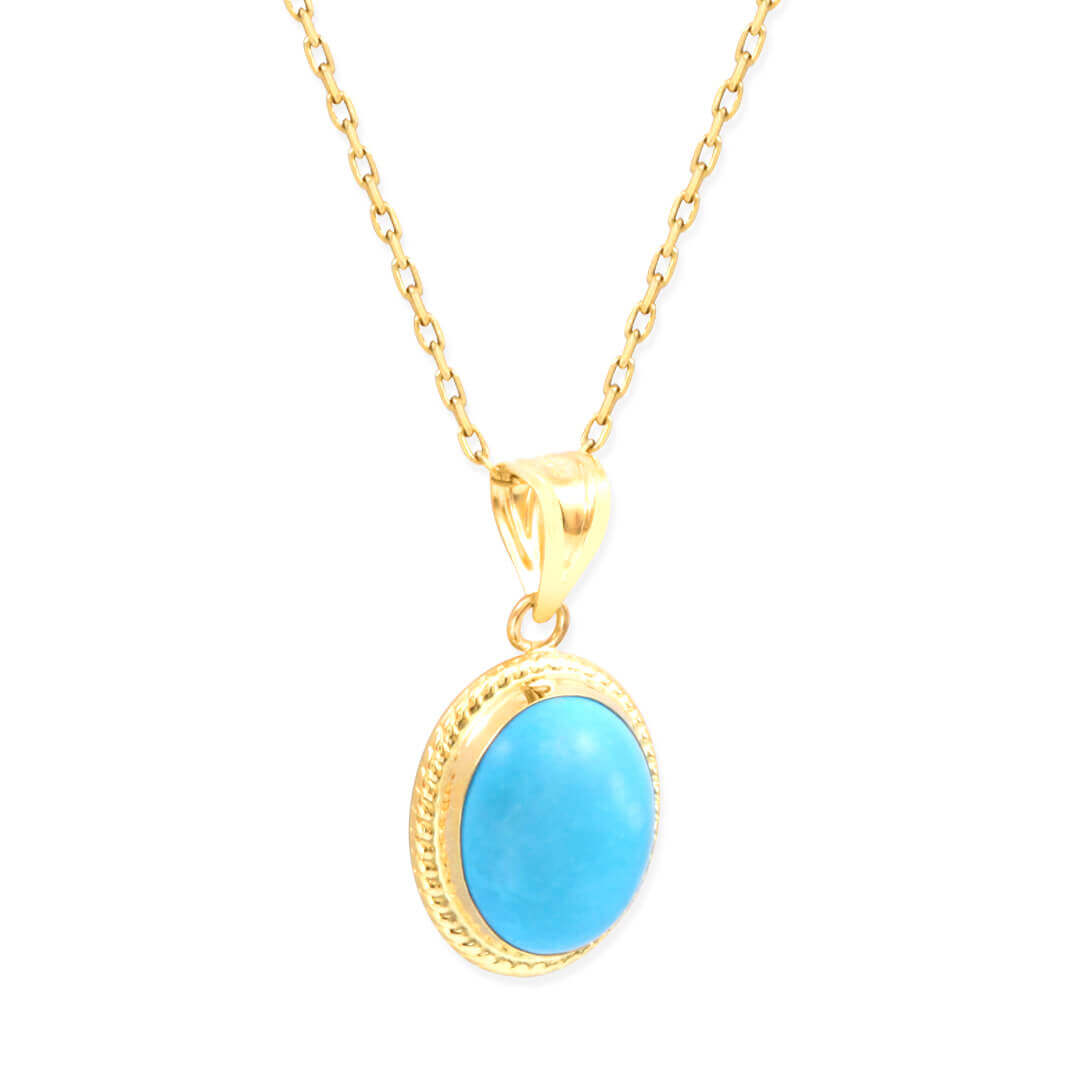 2.4 Cm Boyutunda 2.95 Gram Ağırlığında 14 Ayar Altın Firuze Taşlı Nostalji Kolye. Sezonun trendi bu şık kolye modeli ile kendinize eskimeyen bir hediye vermeye ne dersiniz? Farklı kolyelerle kombine olarak kullanabileceğiniz gibi modele küpe ve yüzüğüyle birlikte takım olarak da sahip olabilirsiniz.