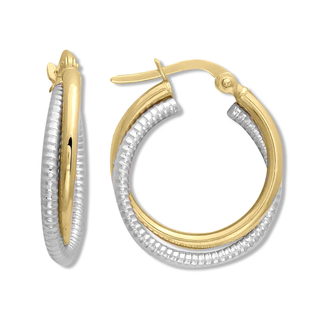 Spor Ve Şık Bir Tasarıma Sahip 1.95 Gram Ağırlığında 2.5 Cm Boyunda Sarı Beyaz İşlemeli Sarmal 14 Ayar Altın Halka Küpe. Günlük kullanıma uygundur, tüm giyim tarzınıza muhteşem uyum sağlar.