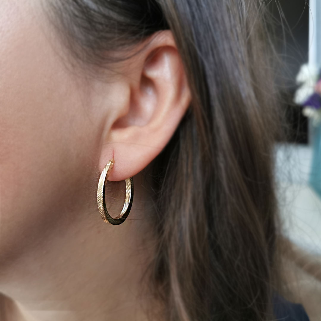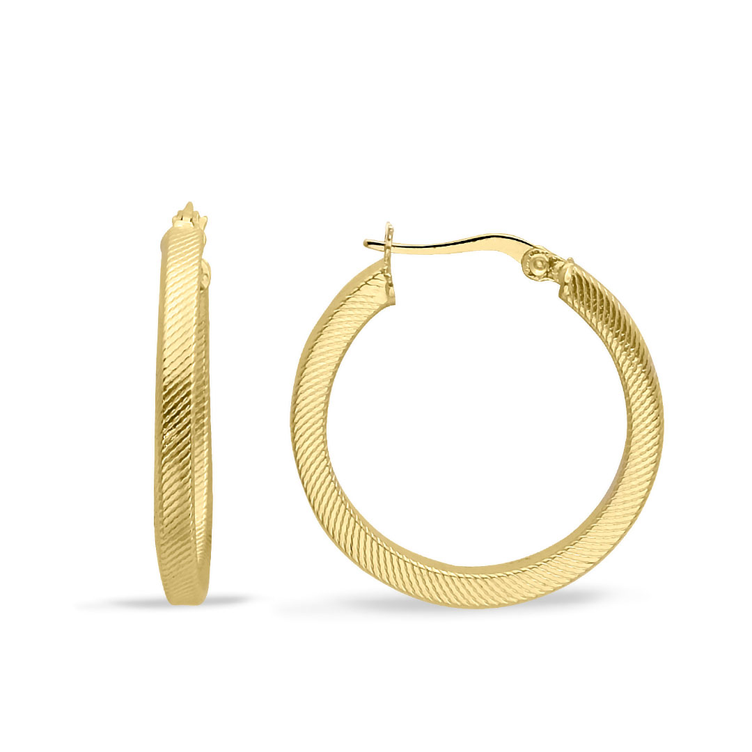 14 Ayar sarı altın her sezonun modası olan ışıl ışıl duruşa sahip kalem işleme detaylı günlük kullanıma uygun 3.80 gram ağırlığında 2.5 Cm boyunda altın halka küpe.