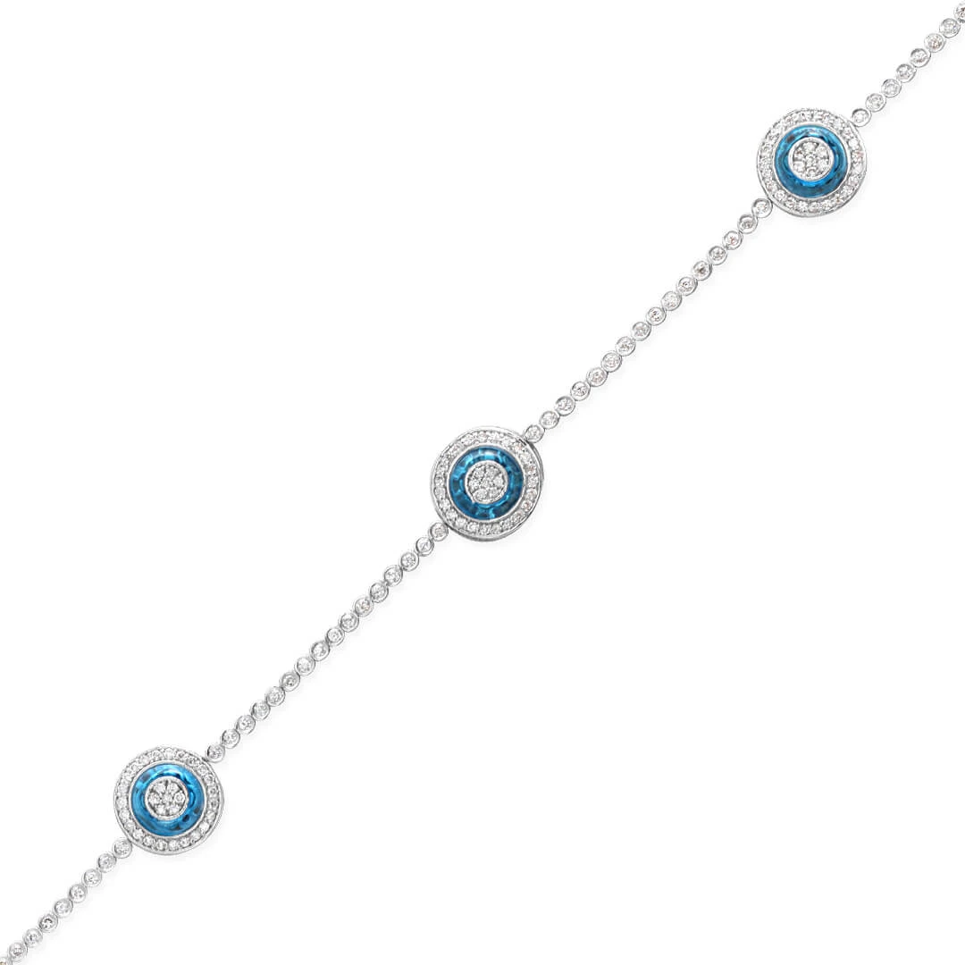 Yuvarlak aqua göz üzeri pırlanta taş kombinasyonu ile özel bir duruşa sahip 14 ayar beyaz altın 0.87 F-SI kesim ışıl ışıl taşlarıyla ışıltısına her anınızda hayran bırakan günlük olarak da kullanabileceğiniz hem fantazi hem spor model pırlanta 3'lü göz bileklik.