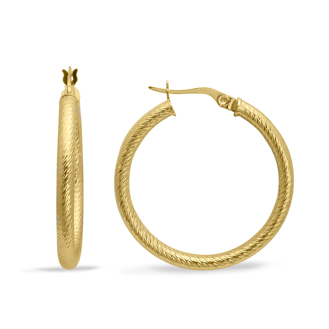 14 Ayar sarı altın her sezonun modası olan ışıl ışıl duruşa sahip kalem işleme detaylı günlük kullanıma uygun 3.65 gram ağırlığında 3 Cm boyunda altın halka küpe.