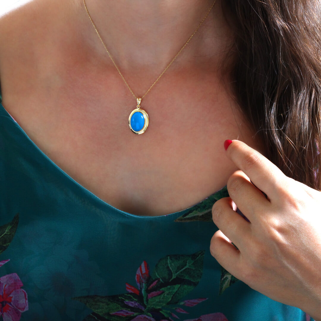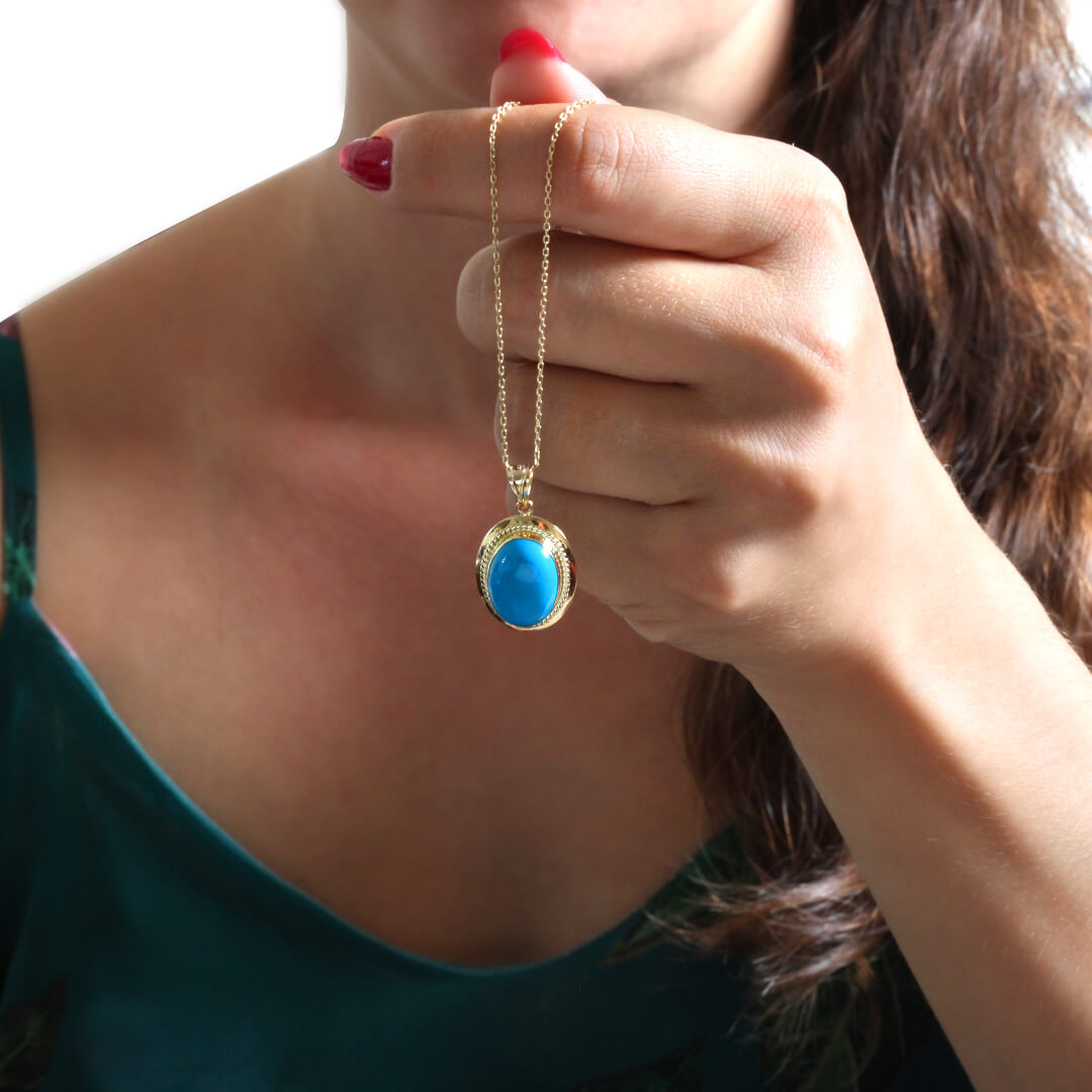 3 Cm Boyutunda 4.00 Gram Ağırlığında 14 Ayar Altın Firuze Taşlı Nostalji Kolye. Sezonun trendi bu şık kolye modeli ile kendinize eskimeyen bir hediye vermeye ne dersiniz? Farklı kolyelerle kombine olarak kullanabileceğiniz gibi modele küpe ve yüzüğüyle birlikte takım olarak da sahip olabilirsiniz.