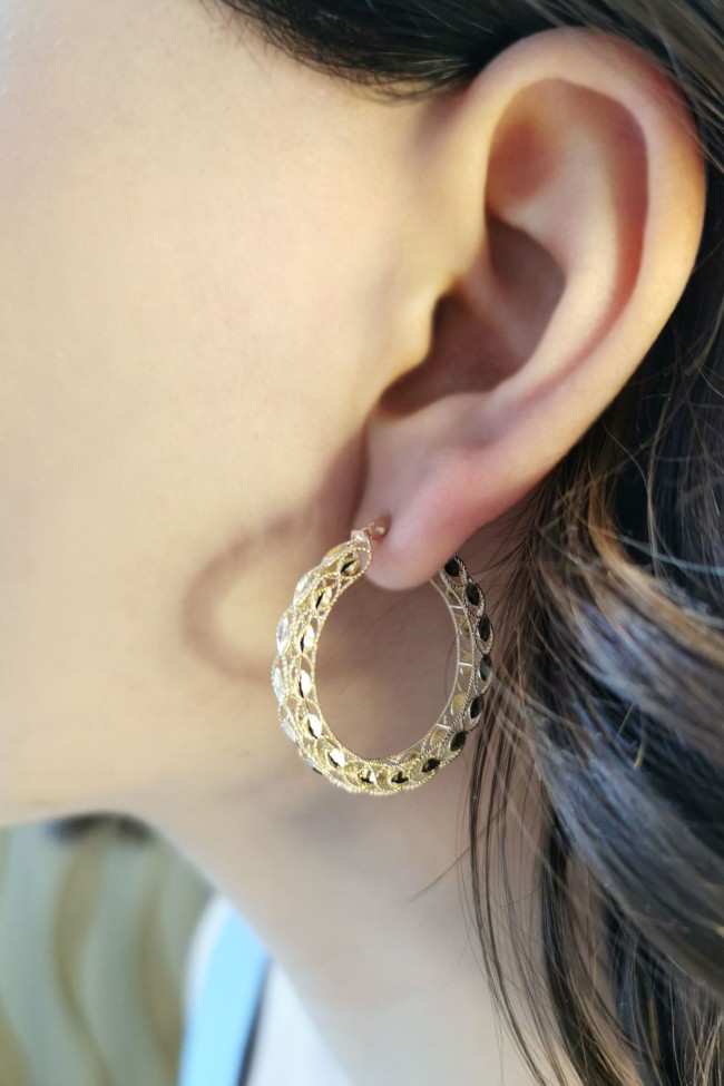 Şık Ve Gösterişli Bir Tasarıma Sahip 4.00 Gram Ağırlığında 3 Cm Boyunda Işıltılı 14 Ayar Altın Pullu Halka Küpe.