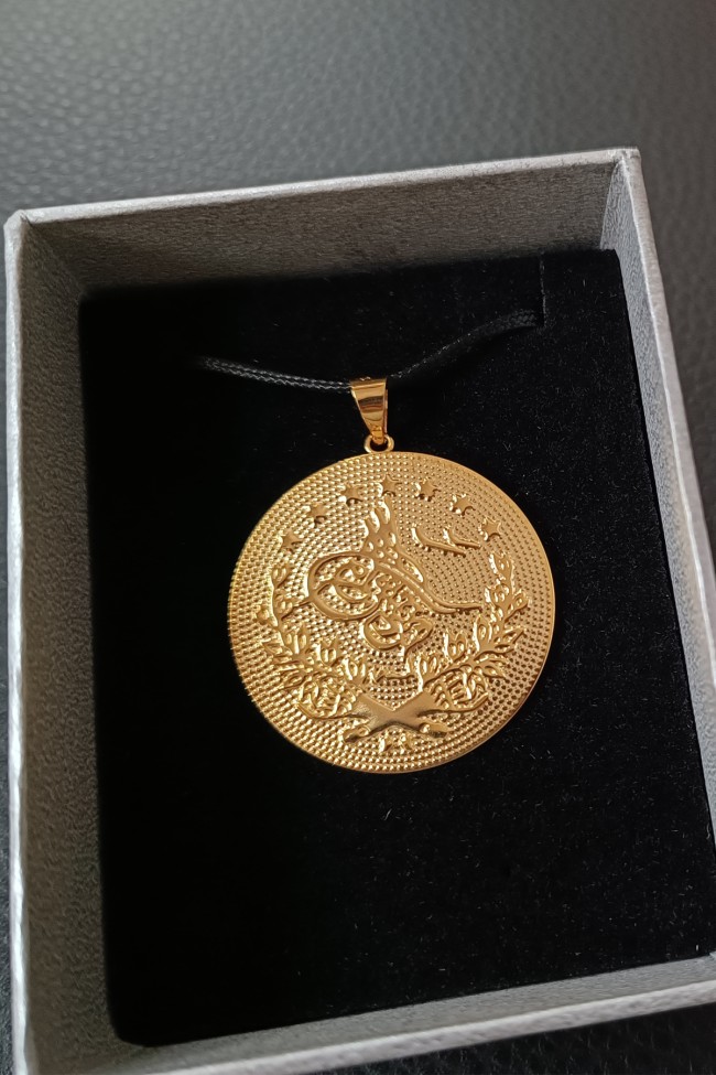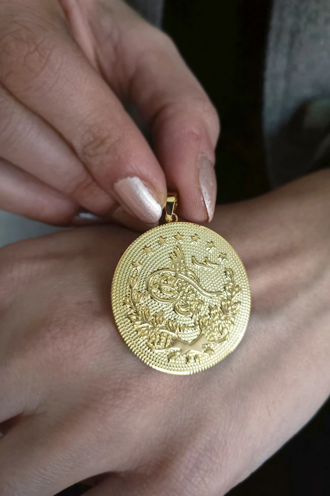 Sezonun trend modası olan altın tuğra kolyeler, düğün, nişan, doğum, yıl dönümü ve doğum günü hediyesi olarak çokça tercih edilen armağan seçeneklerinden. Model boyutu tepelikten uca 3.5 cm olup zincirsiz olarak satışa sunulmuştur, 3.10 gram ağırlığındadır.
