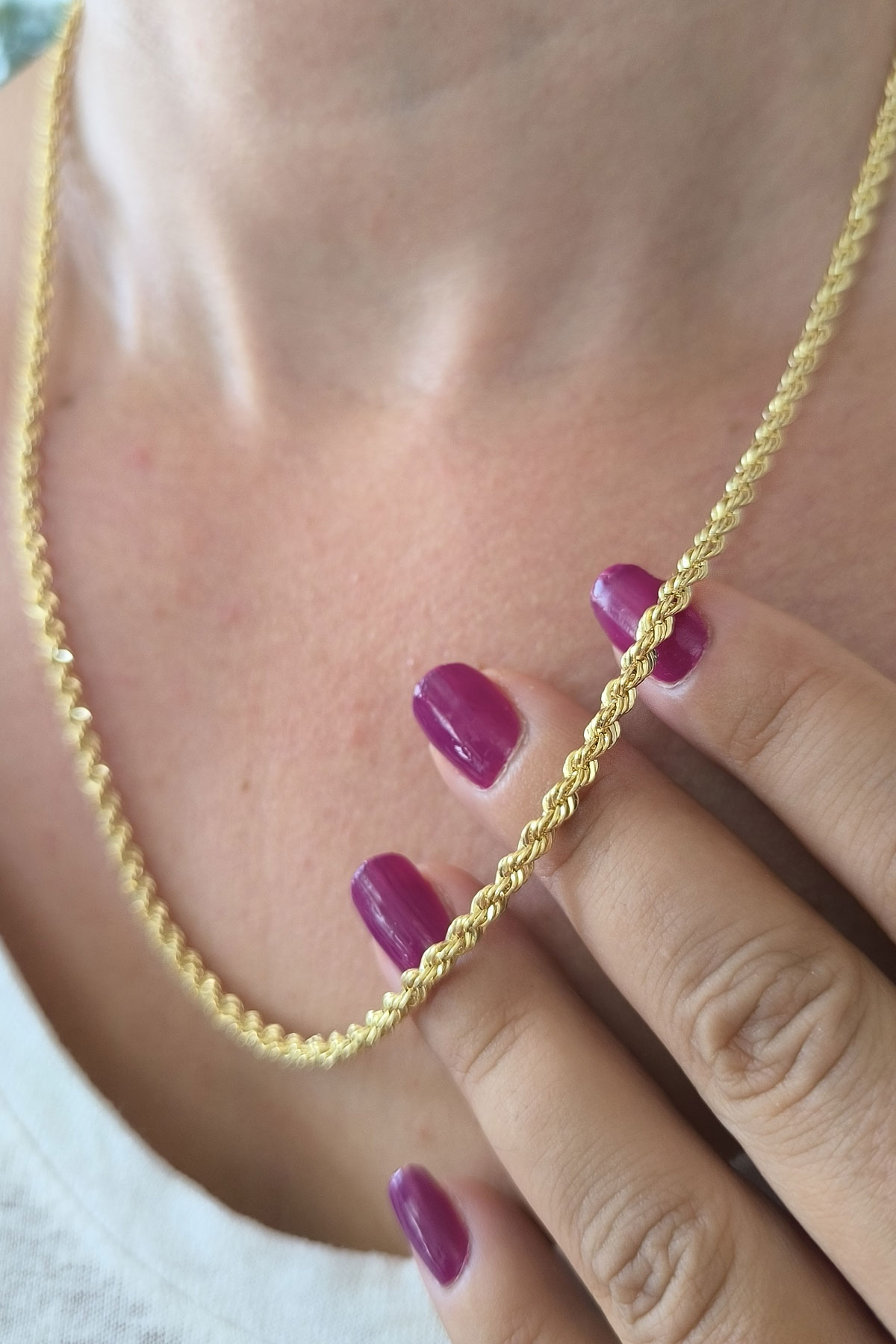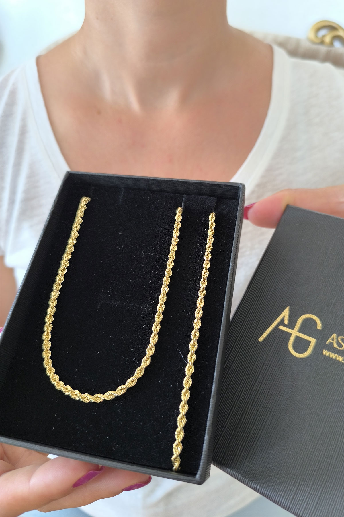9.40 Gram ağırlığında 55 cm kolyesi ve 18 cm bilekliği ile sezona yeniden damga vuran halat zincir modelimiz şık ve sağlam duruşu ile tüm kolye uçlarınızla uyum sağlayacak. Günlük kullanımda severek tercih edeceksiniz, tek başına kombin olarak da kullanabilirsiniz.