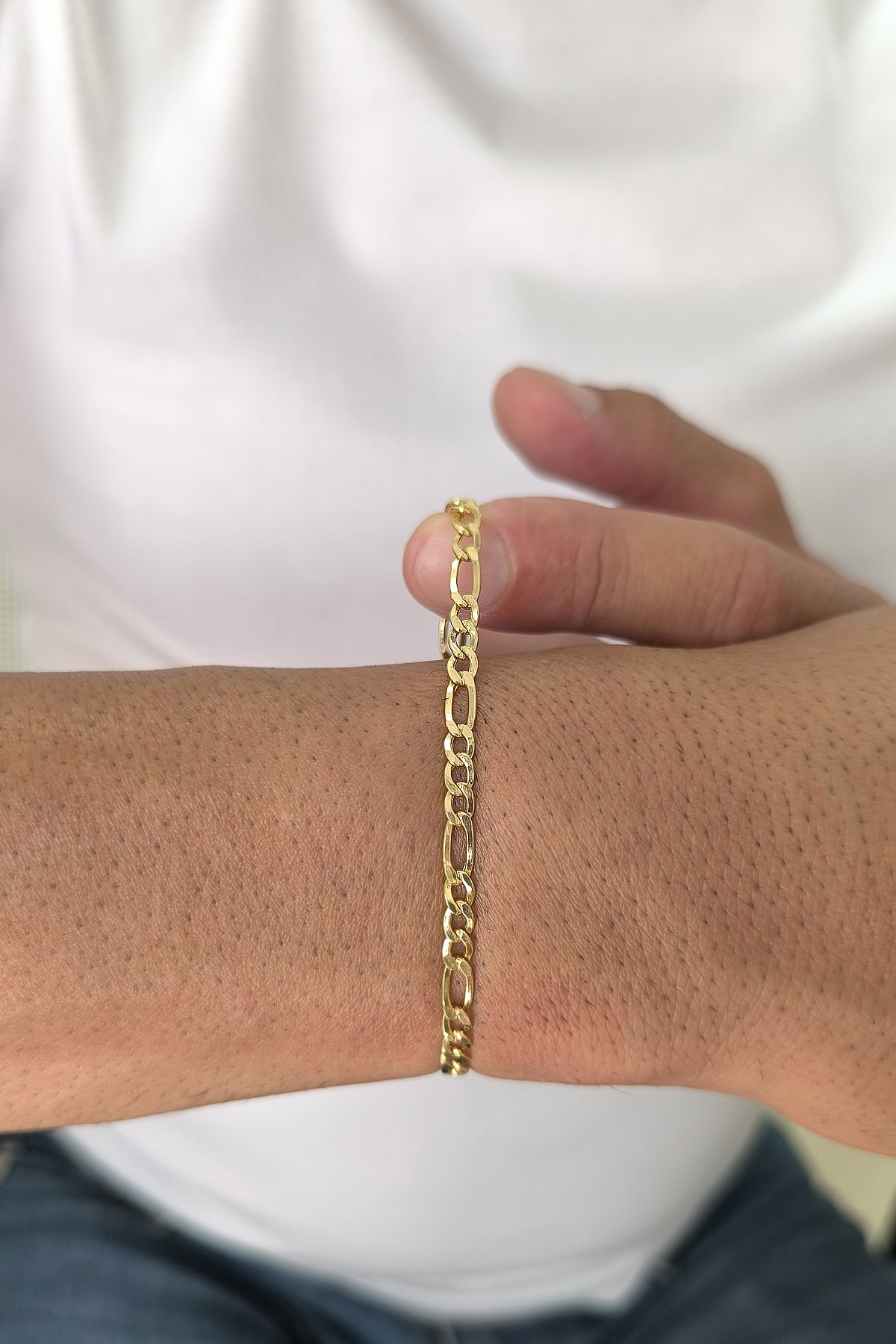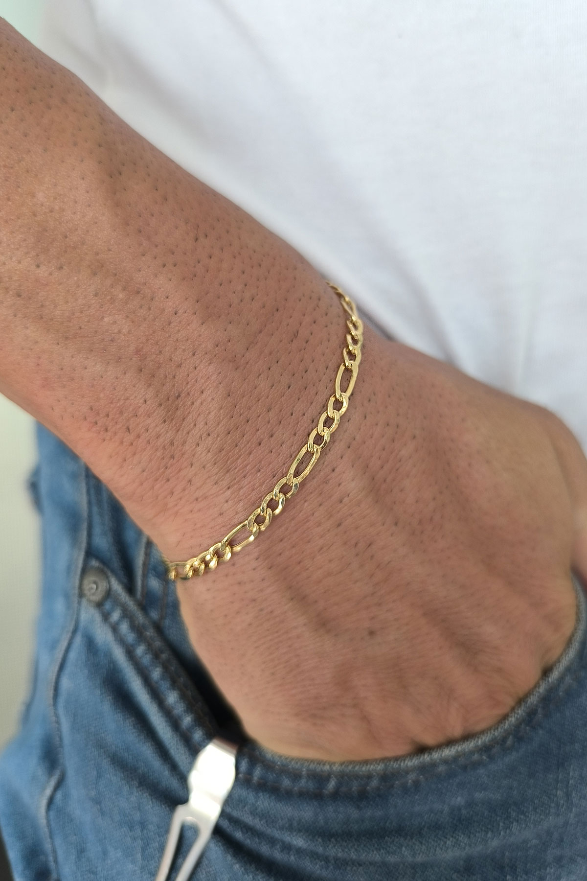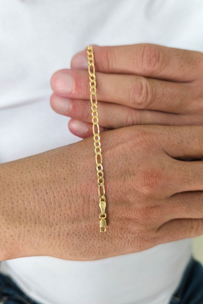 Klasik Figaro zincir formunun modern bir yorumunu sunan bu model, dayanıklı yapısı ve zamansız çizgisiyle şık bir altın erkek bileklik arayanlar için ideal bir seçimdir. Günlük kullanımda sade bir stil sunarken, özel gün kombinlerine de güçlü bir dokunuş ekler.
