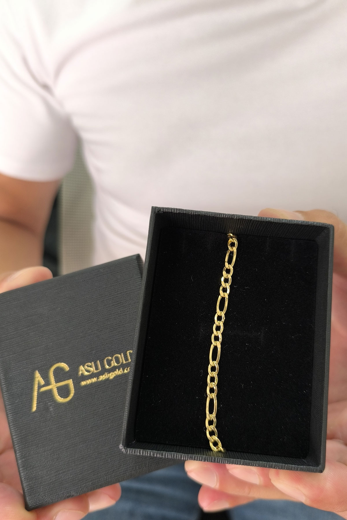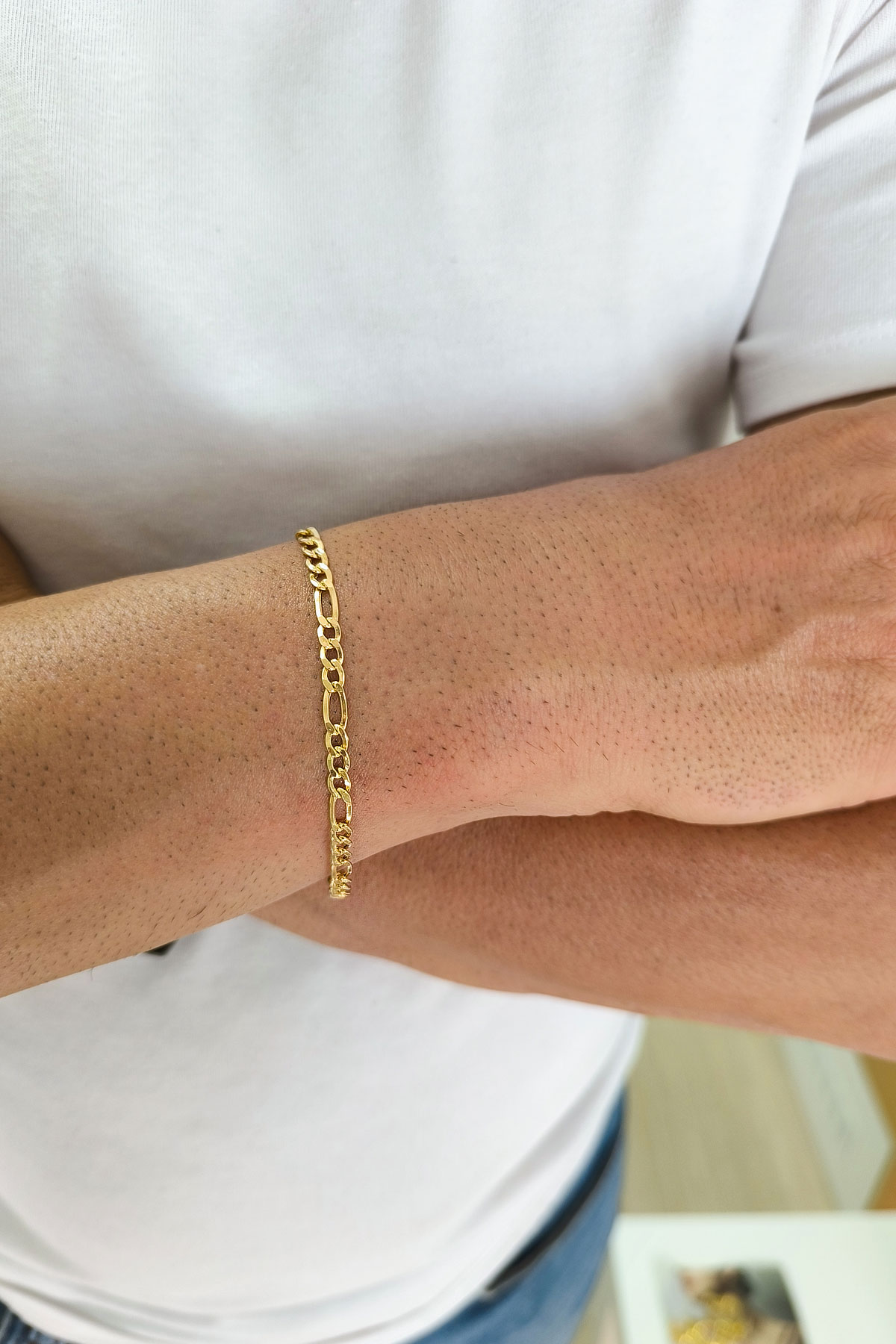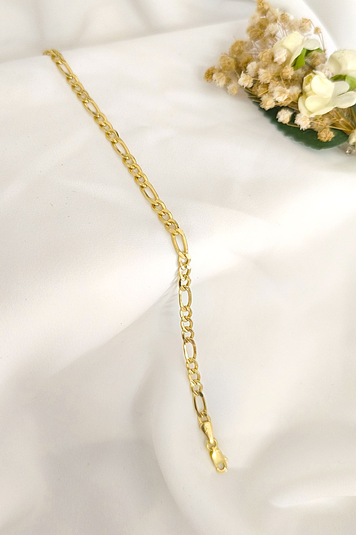 Klasik Figaro zincir formunun modern bir yorumunu sunan bu model, dayanıklı yapısı ve zamansız çizgisiyle şık bir altın erkek bileklik arayanlar için ideal bir seçimdir. Günlük kullanımda sade bir stil sunarken, özel gün kombinlerine de güçlü bir dokunuş ekler.