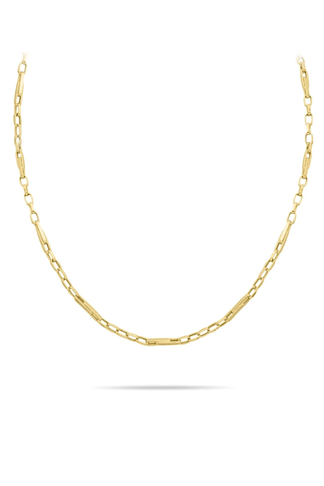 14 Ayar spor ve şık tasarıma sahip ışıl ışıl günlük kullanıma uygun 8.60 gram ağırlığında 55 Cm uzunluğunda altın grek desenli unisex zincir kolye.