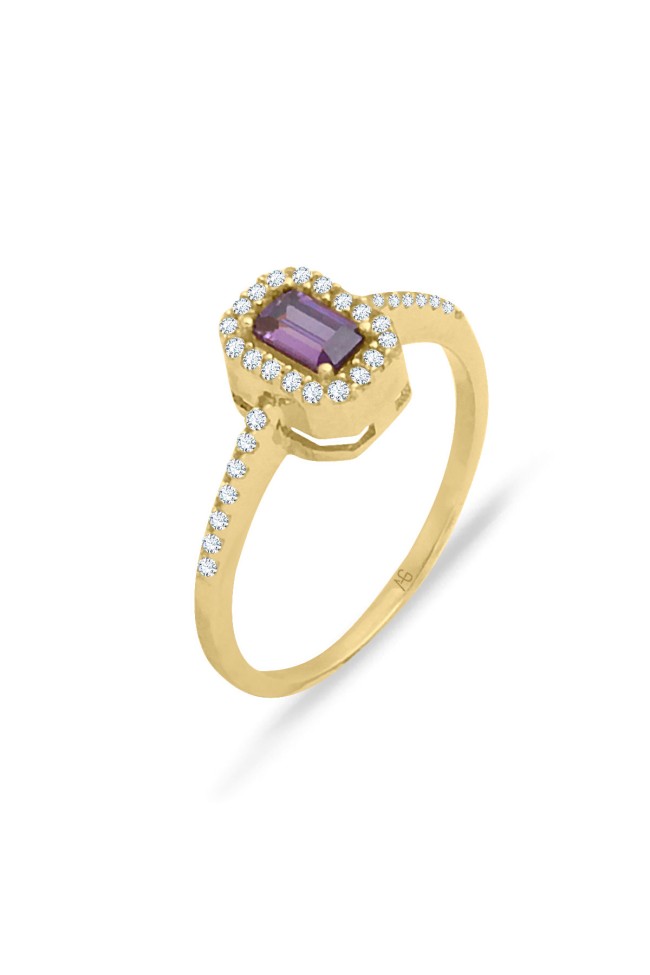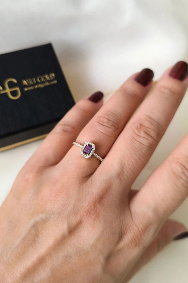 14 ayar sarı altın alexsandrite taşlı baget tasarımıyla günlük kullanıma uygun 2.00 gram ağırlığında zirkon taşlı minimal tasarım kadın yüzük.