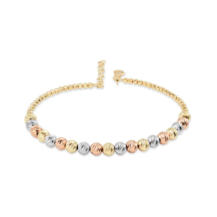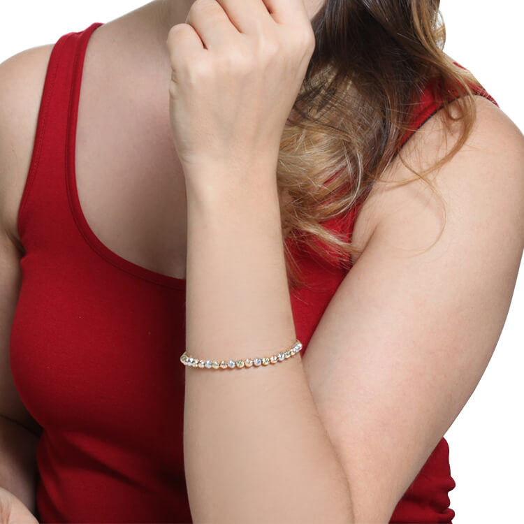Orta boy kırmızı sarı ve beyaz kalemli ışıltılı topların bir araya gelerek kombinasyonu ile tasarlanmış şık ve günlük kullanıma uygun hediyelik bilezik.