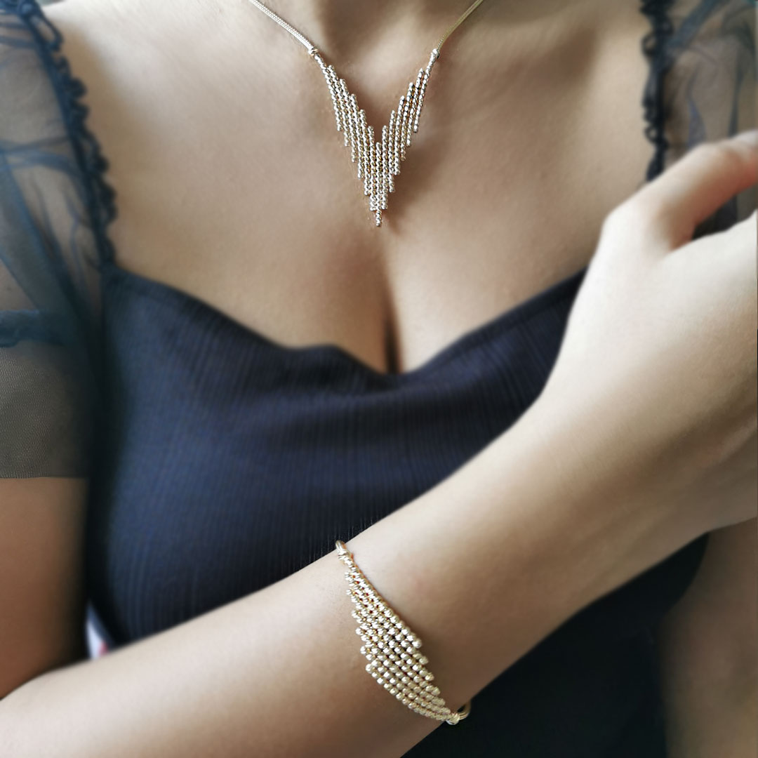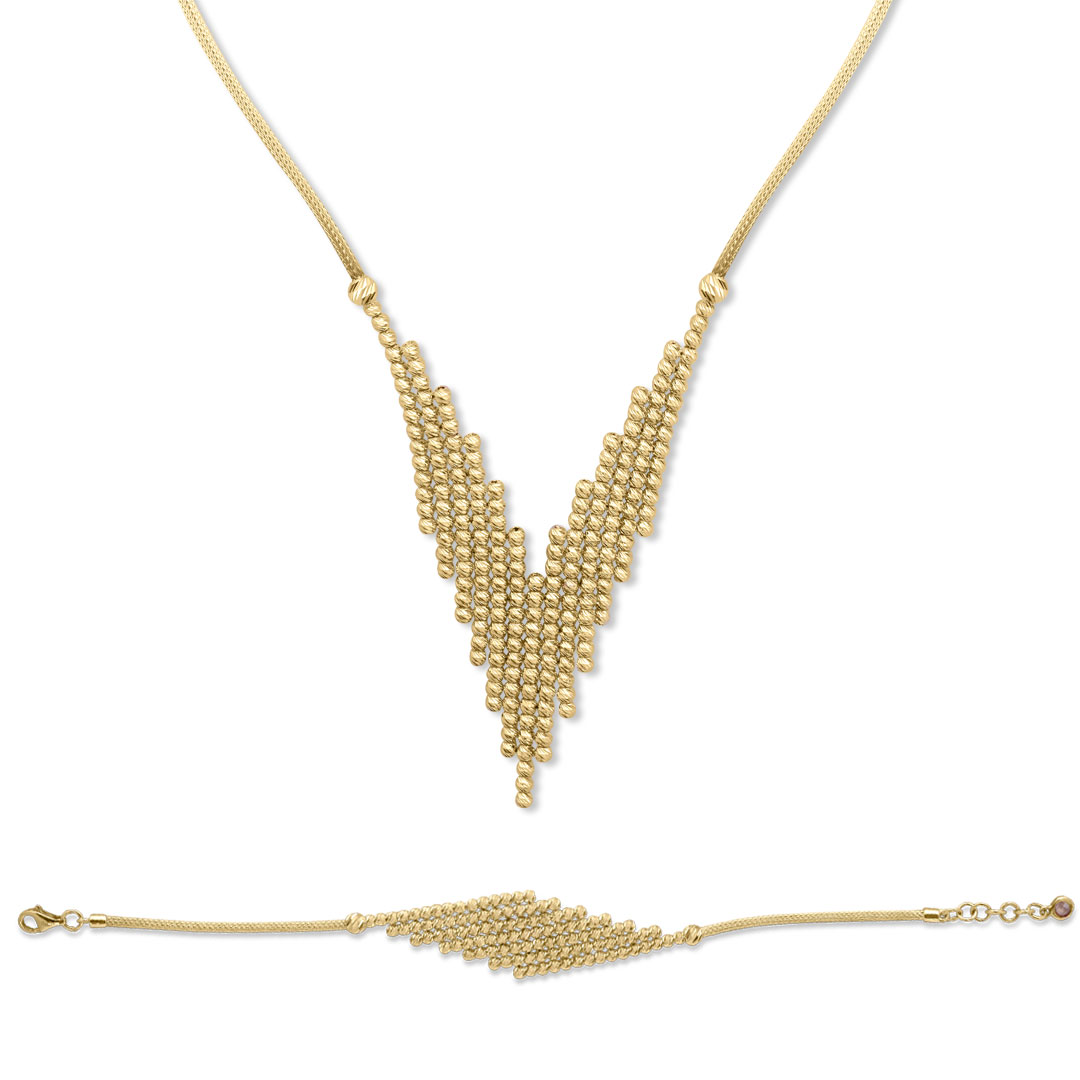 14 Ayar Özel Kalemli 20.15 Gr Ağırlığında Asimetrik Top Dizili Özel İşçilikle Tasarlanmış Ve Üretilmiş Taşsız Bileklik ve Gerdanlıktan Oluşan Altın İtalyan Takı Seti.
