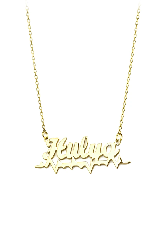 Her harfin altında uzanan o ritim, hayatın en gerçek anlarını temsil ediyor. Sevdiğin birinin adını taşıyan bu kalp atışı isim kolye, onun senin için ne kadar “hayati” olduğunu fısıldar gibi. İlk bakışta zarif bir altın kolye, yakından bakıldığında ise duyguların altınla buluşmuş hâli.