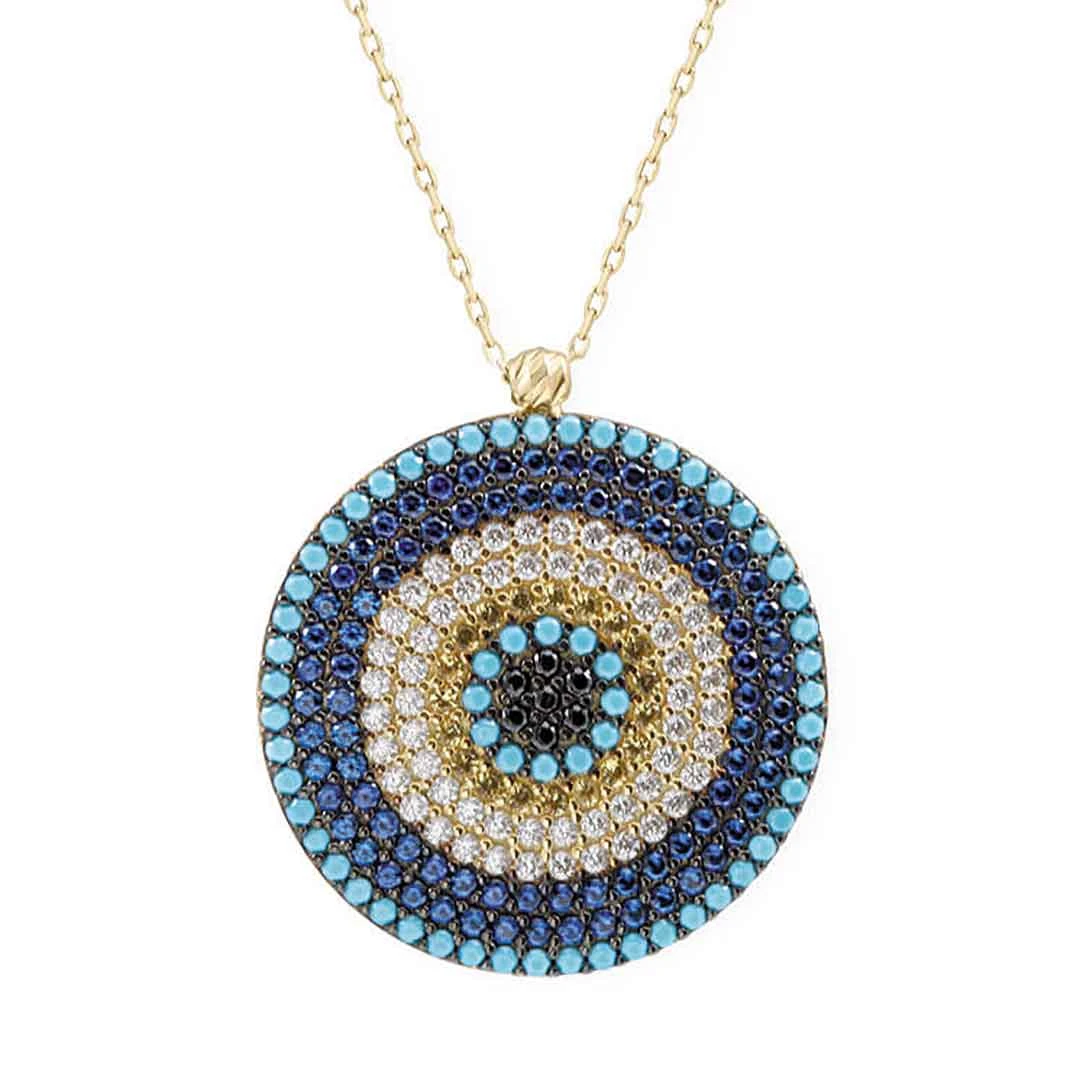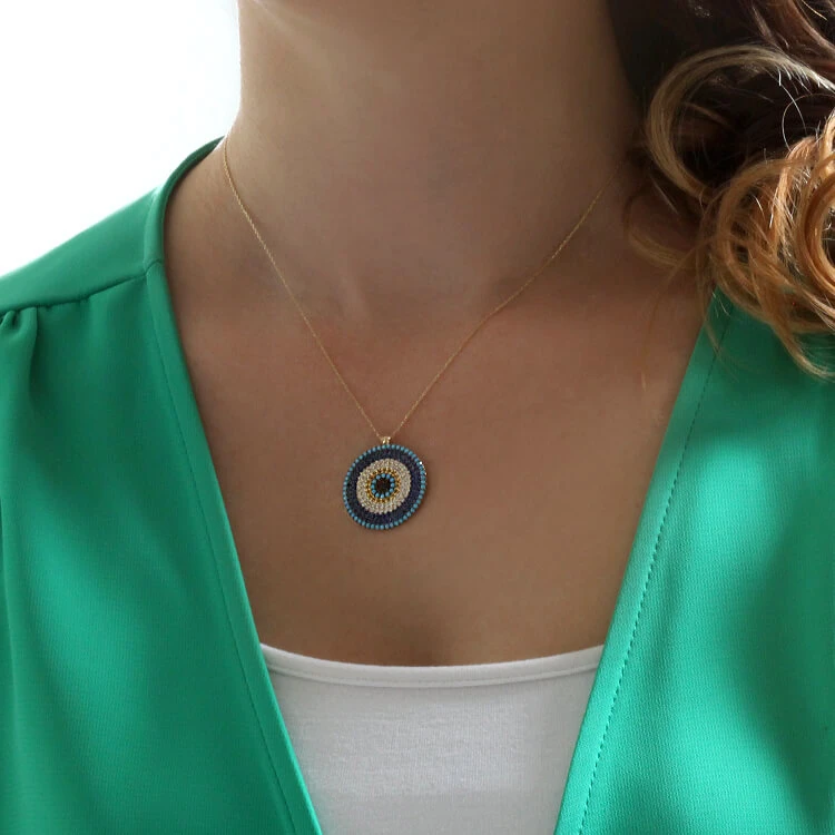 Büyük boy uyumlu renk geçişleriyle oldukça gösterişli duruşa sahip yaklaşık olarak çapı 2,8 cm nazar boncuğu kolye.
