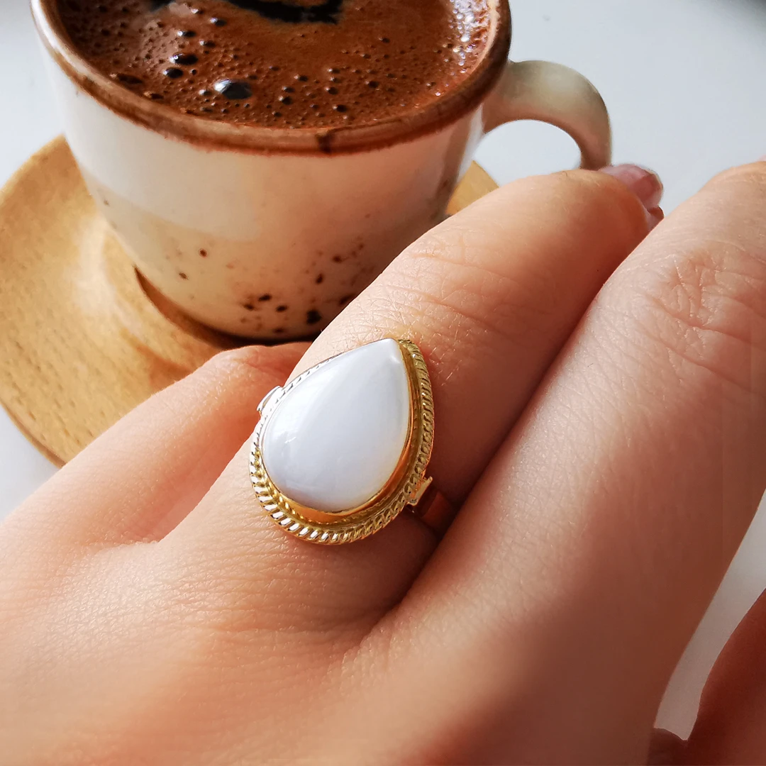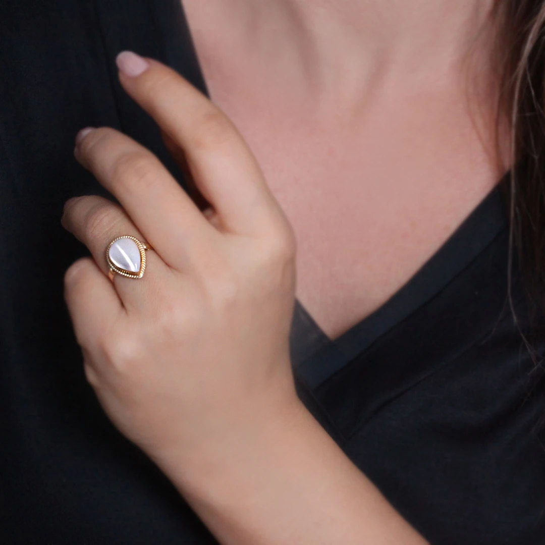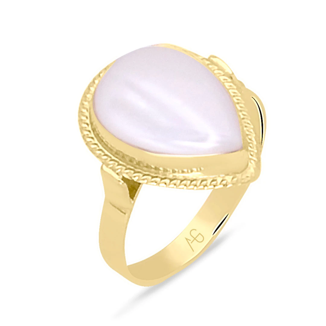 14 Ayar nostalji tasarımına eşlik eden sedef beyaz damla taş detaylı şık ve ışıltılı tasarımlara düşkün kadınların severek kullanacakları elegan duruşa sahip günlük kullanıma uygun 2.60 gram ağırlığında altın yüzük.
