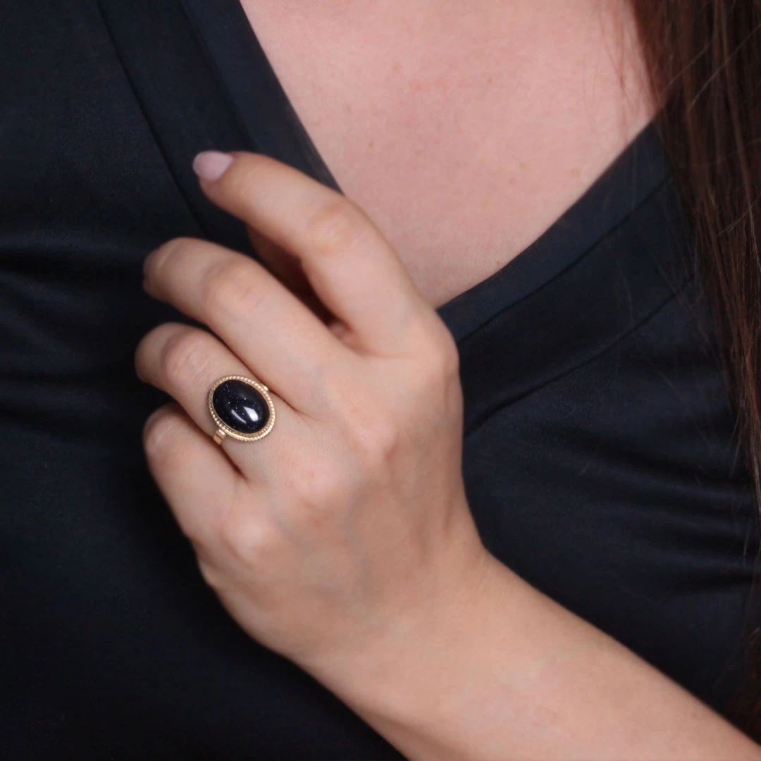 14 Ayar nostalji tasarımına eşlik eden simli büyük oval boy onix taş detaylı şık ve ışıltılı tasarımlara düşkün kadınların severek kullanacakları elegan duruşa sahip günlük kullanıma uygun 3,05 gram ağırlığında altın yüzük.