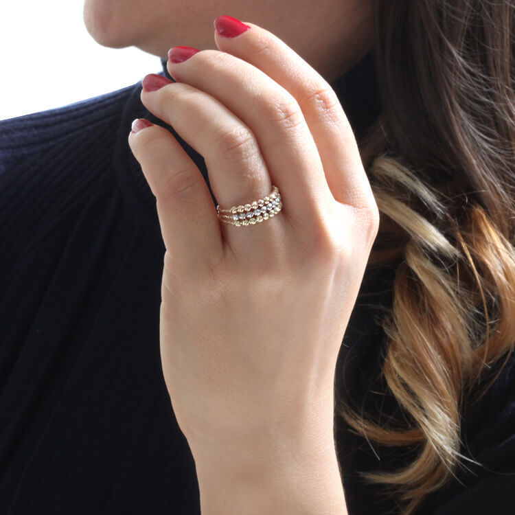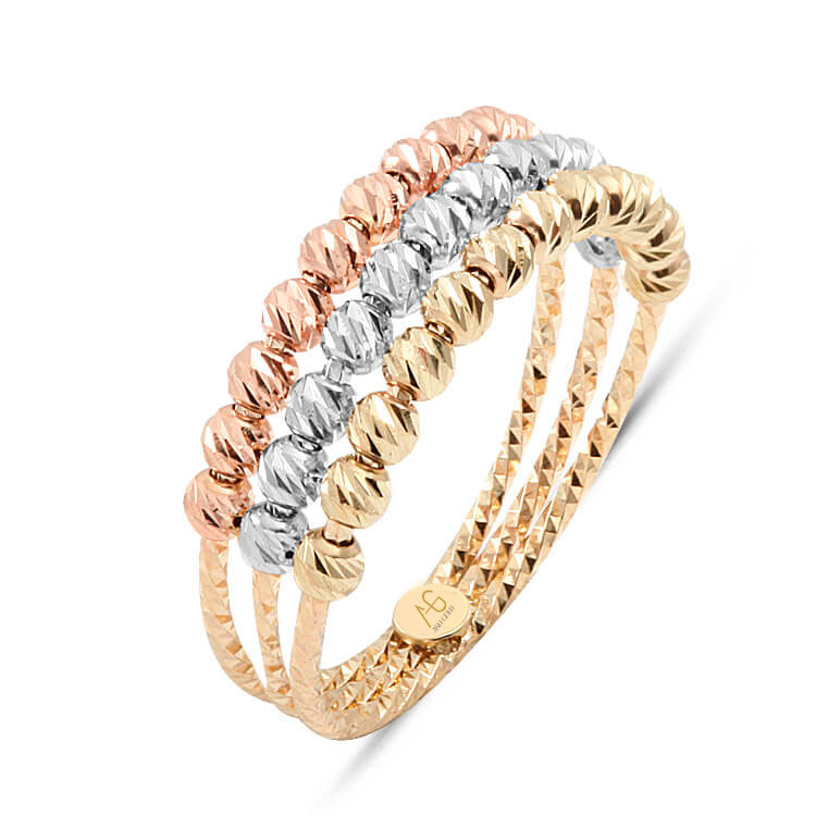 3 sıra, renkli altın topların kombinasyonuyla tasarlanmış ışıl ışıl modern ve spor tasarıma sahip 3.20 gram ağırlığında dorika 14 ayar yüzük. İsterseniz orta parmak isterseniz yüzük parmağınızda kullananın, günlük şıklığınıza hava katın!