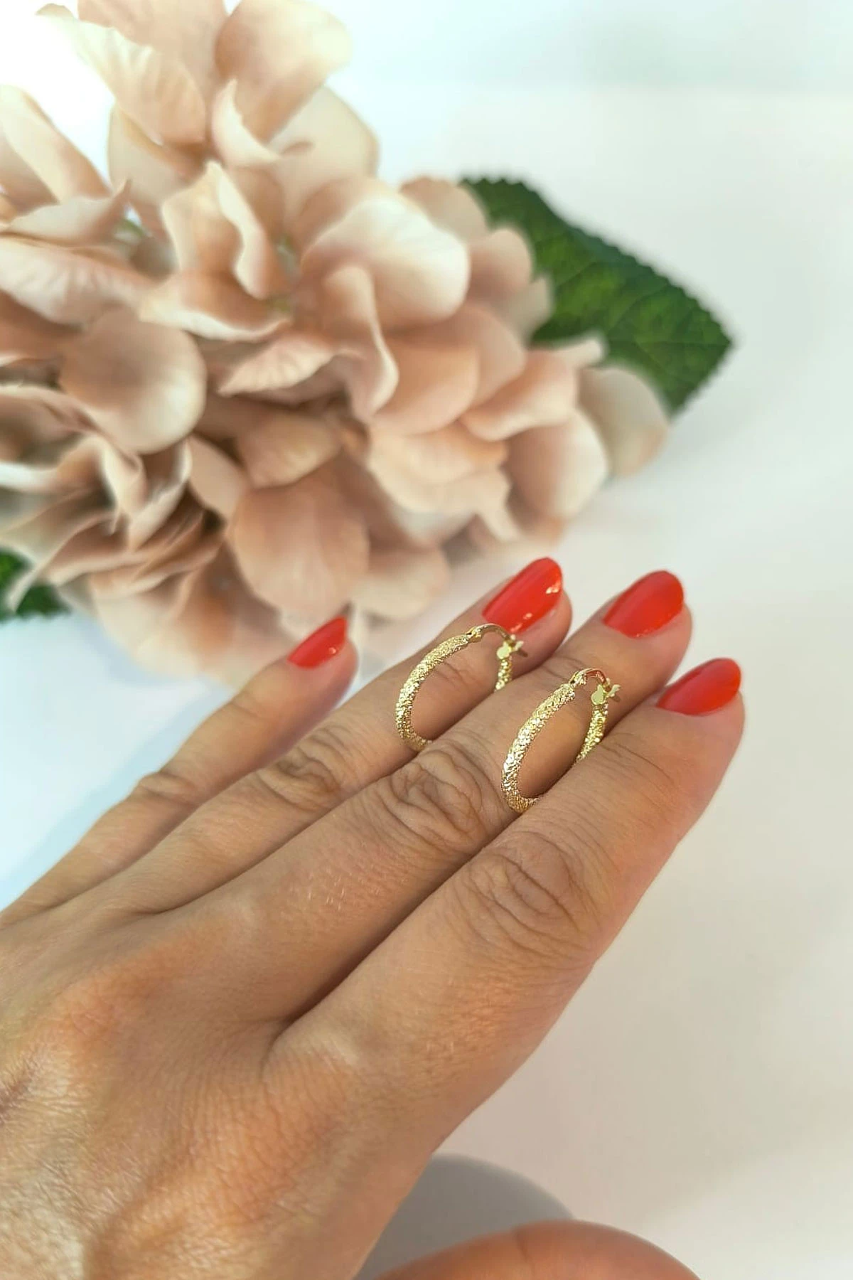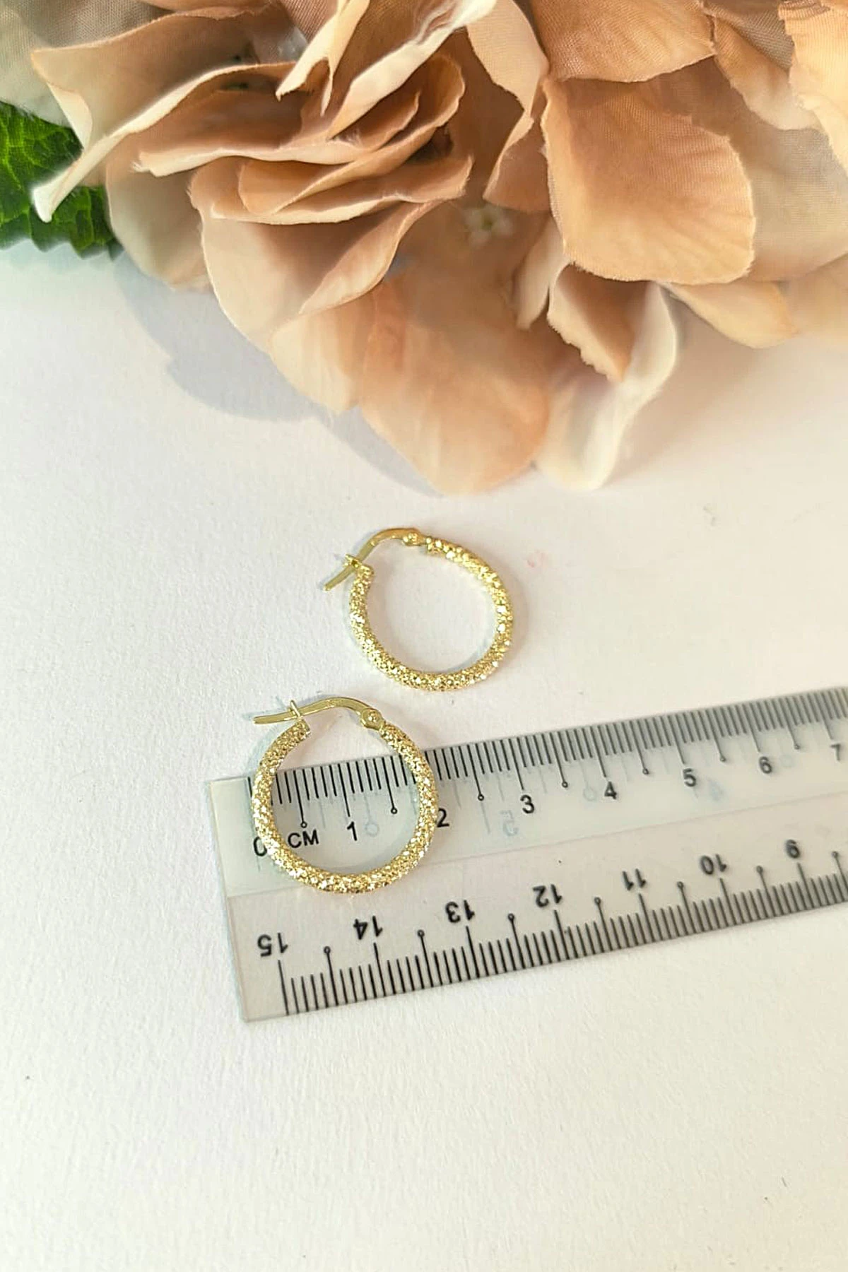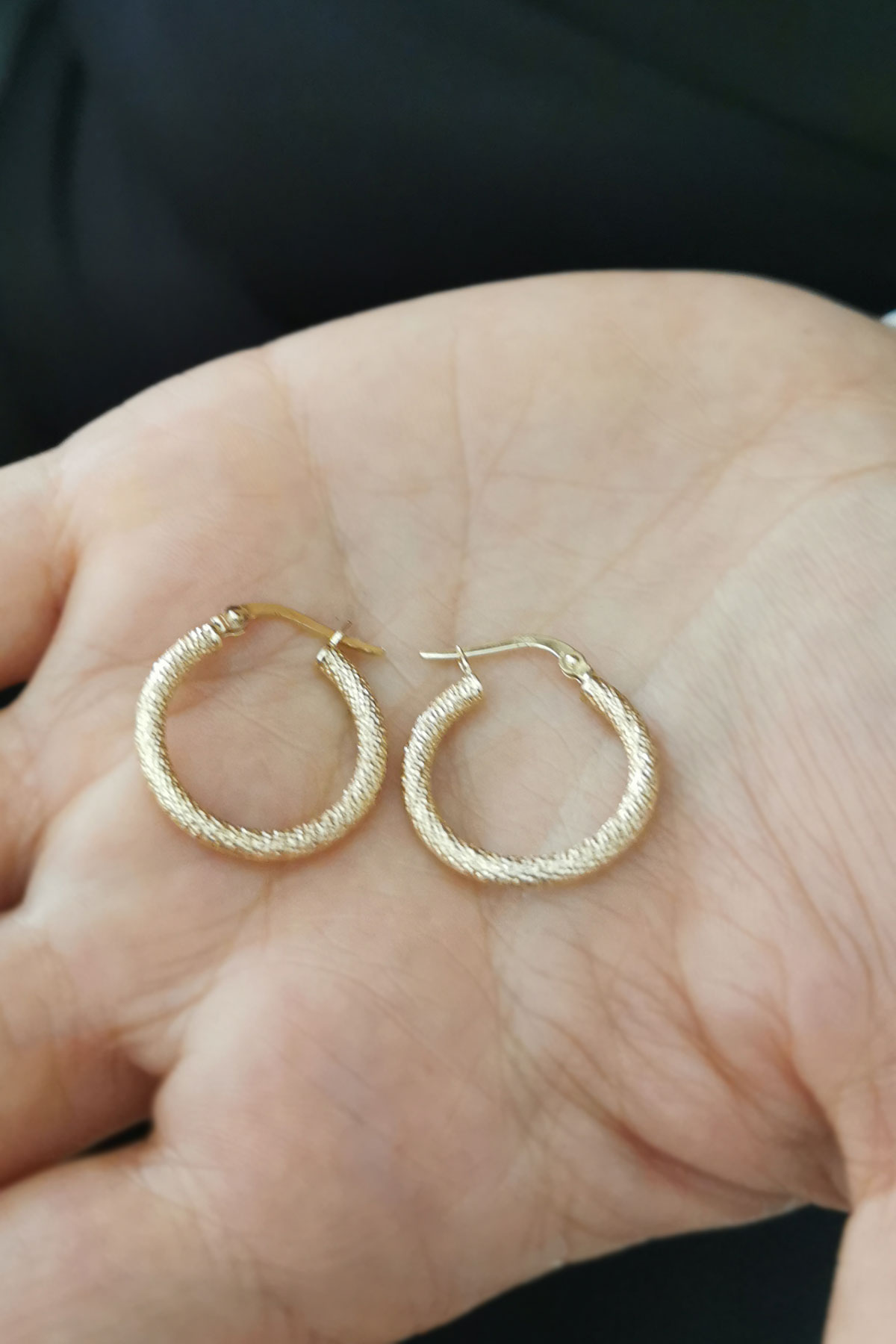 Işıltılı Bir Tasarıma Sahip İnce Bombeli 1.40 Gram Ağırlığında 2 Cm Boyunda Sim İşlemeli 14 Ayar Altın Halka Küpe.