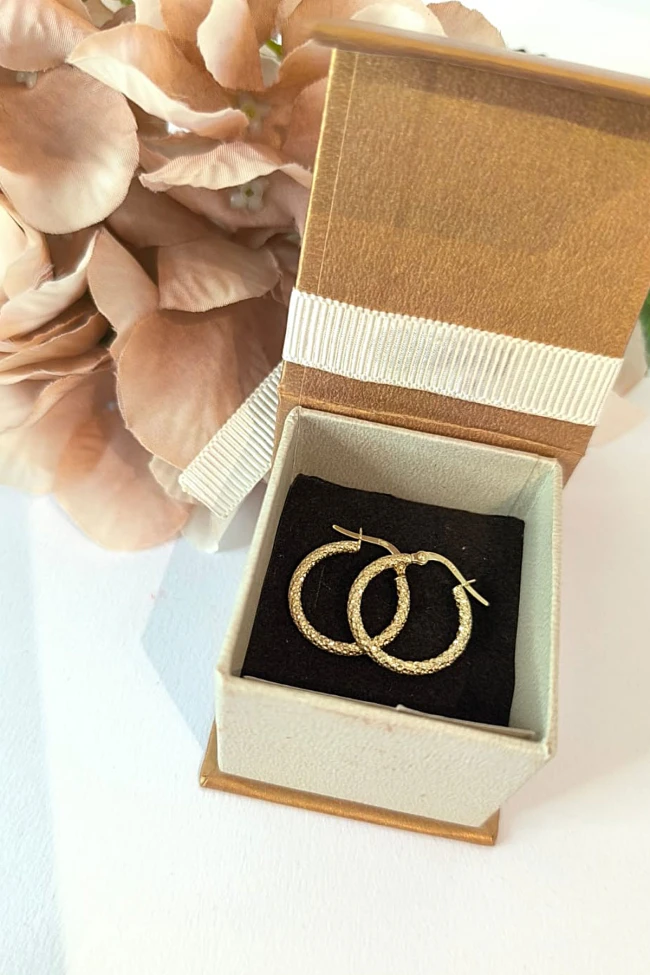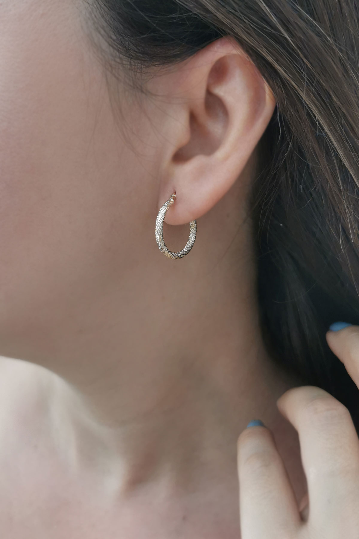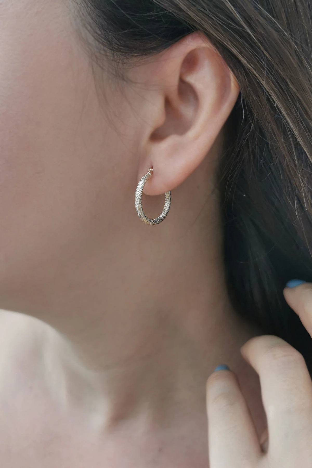Işıltılı Bir Tasarıma Sahip İnce Bombeli 1.40 Gram Ağırlığında 2 Cm Boyunda Sim İşlemeli 14 Ayar Altın Halka Küpe.