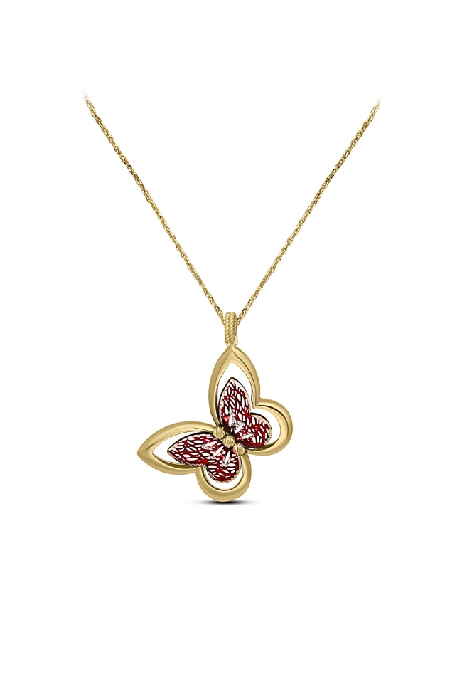 4.10 Gram Ağırlığında Kelebek Model Özel İtalyan Tasarım Olan Şık Kırmızı Gövde Detaylı 14 Ayar Altın Kadın Fantazi Kolye.