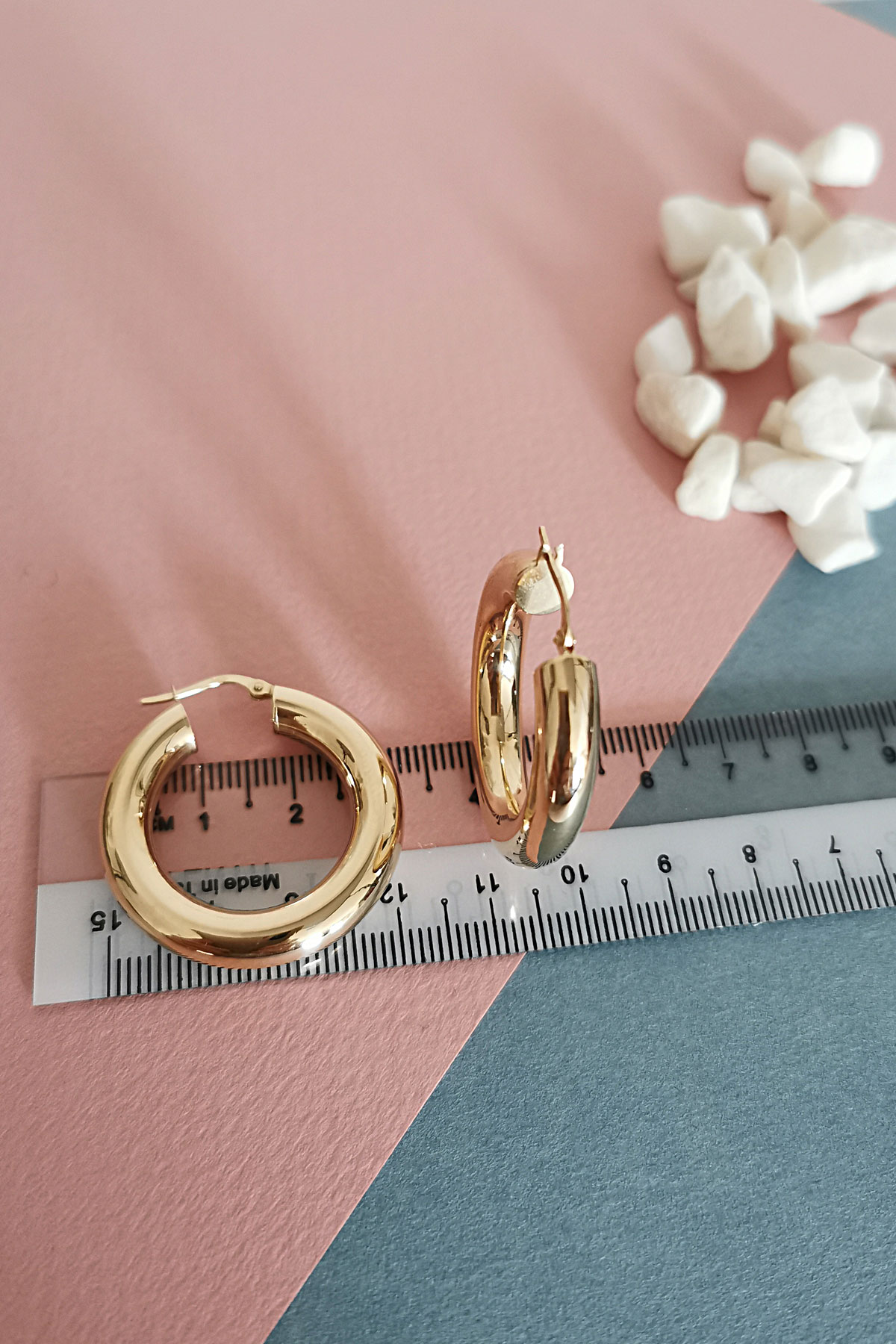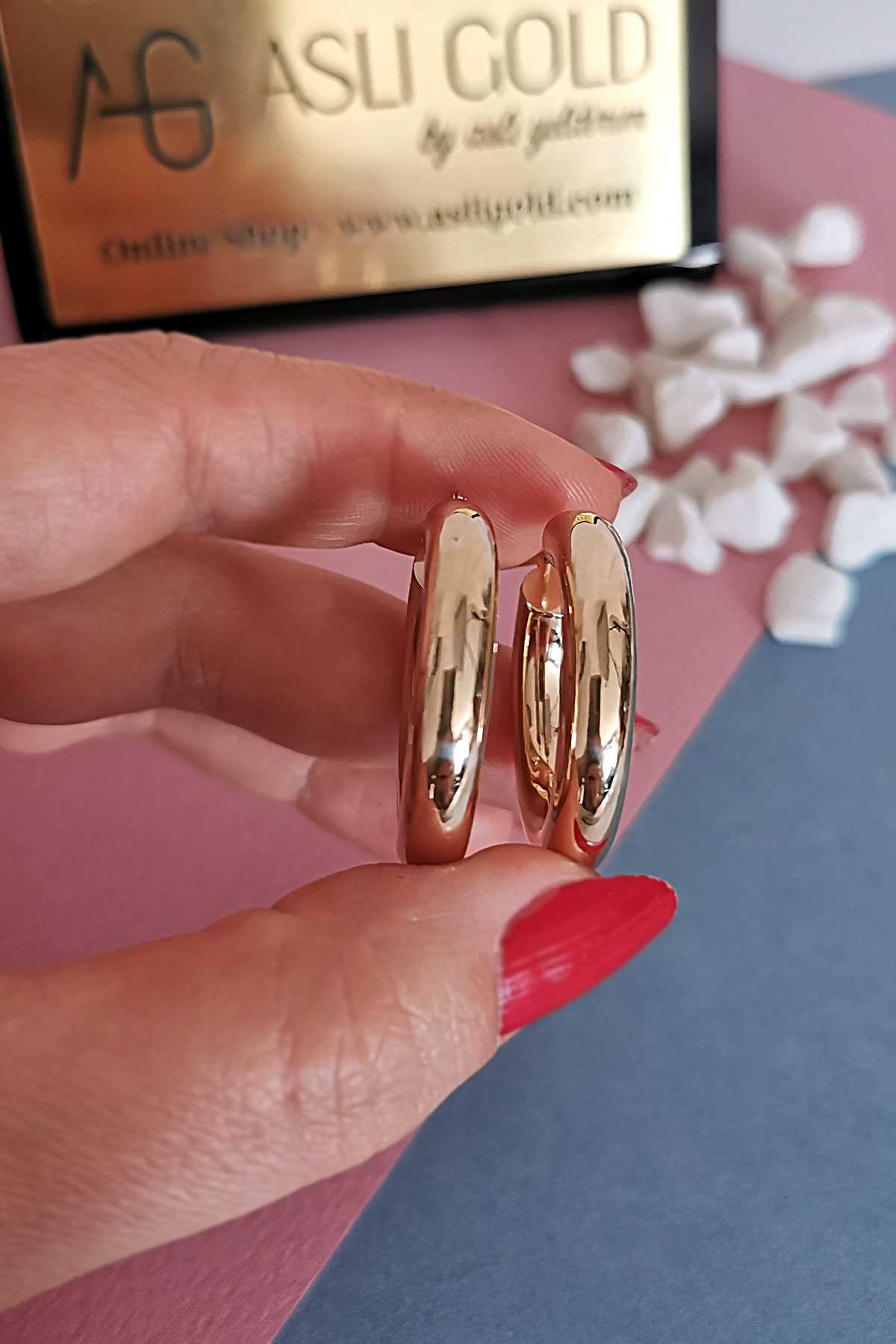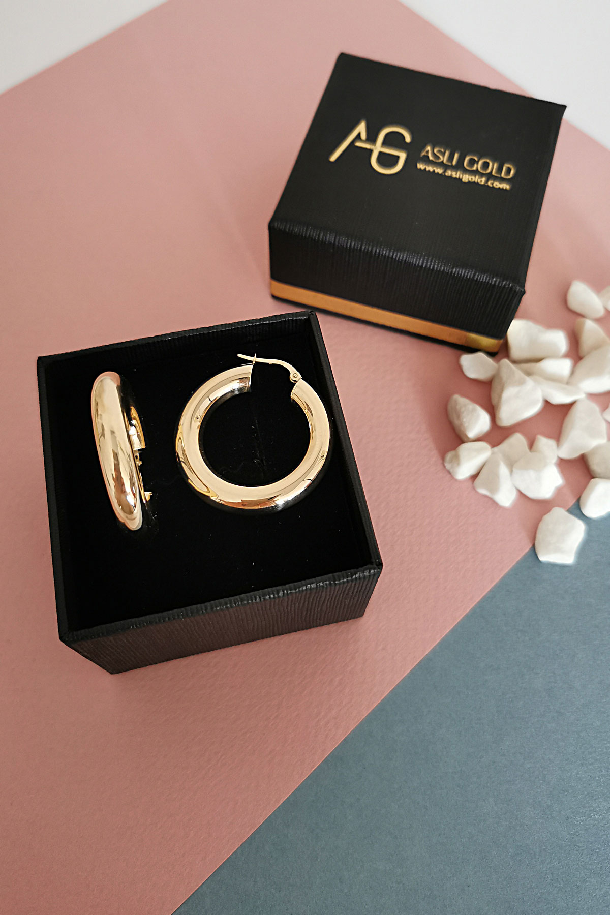 14 Ayar 3 Cm Boyunda 5.5 Gr Ağırlığında Sade, Spor Ve Dolgun Bir Duruşa Sahip, Günlük Kullanıma Uygun Altın Kalın 6 Mm Halka Küpe.