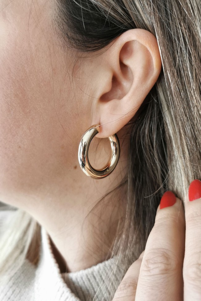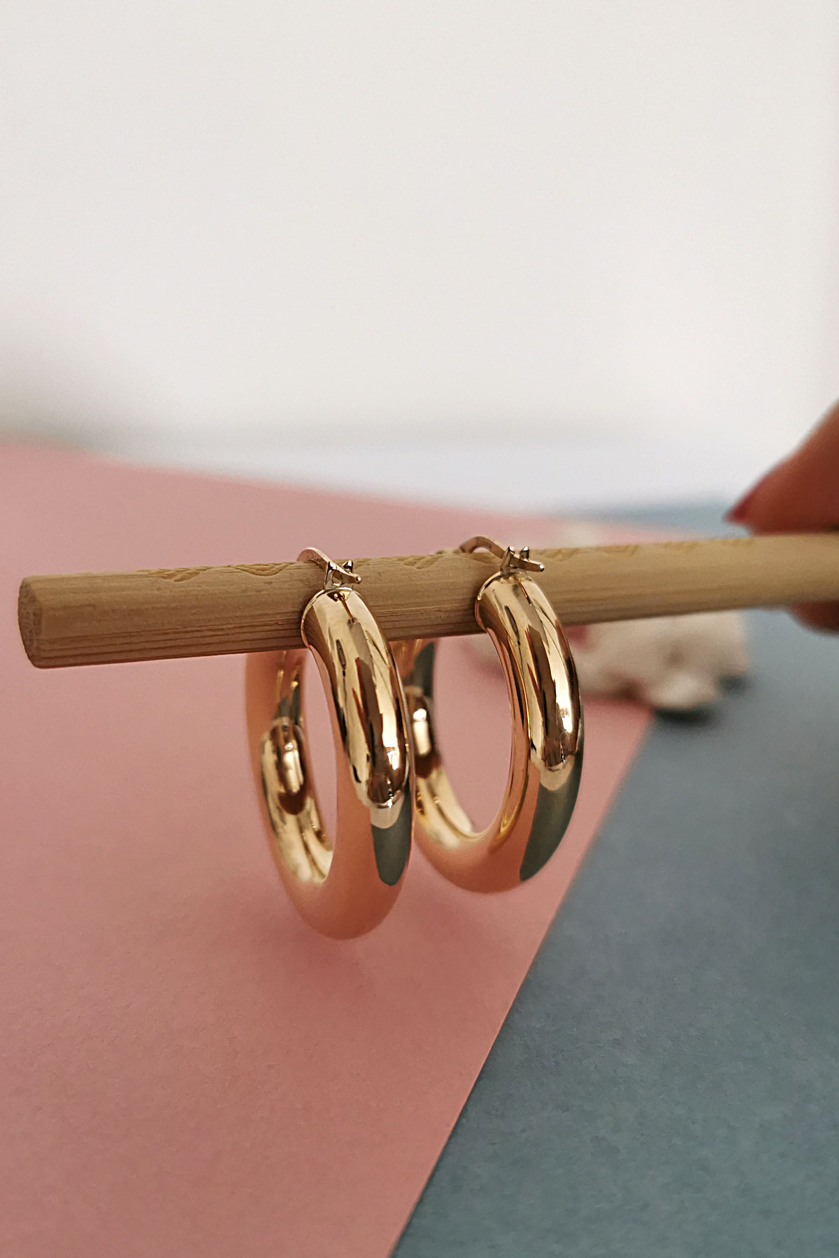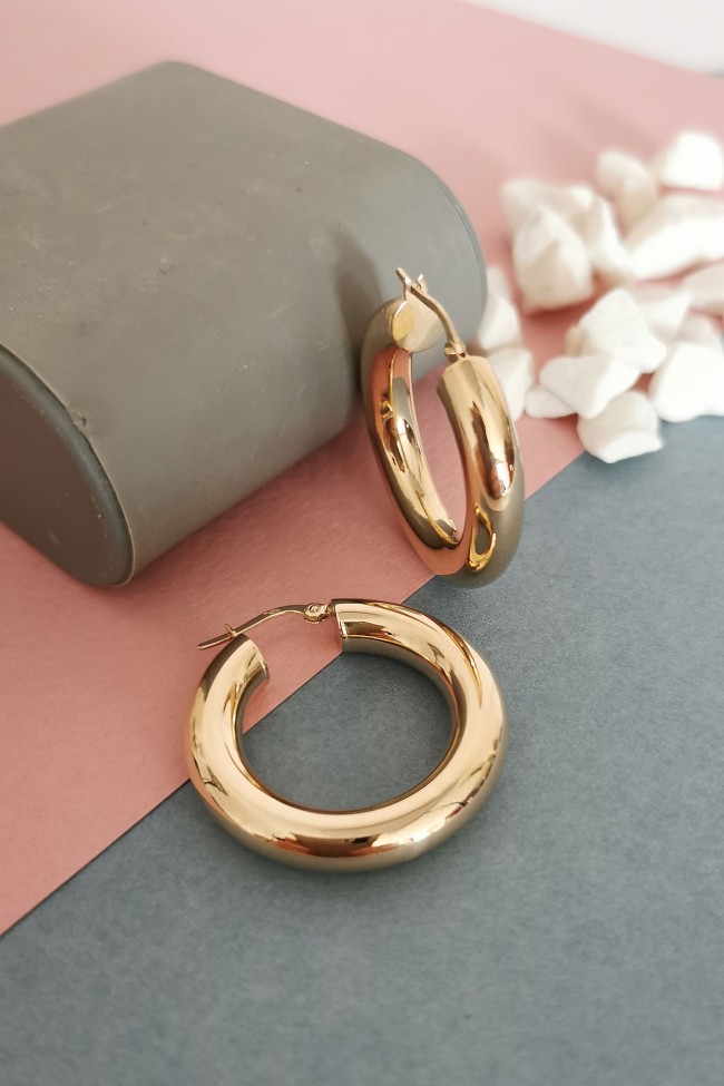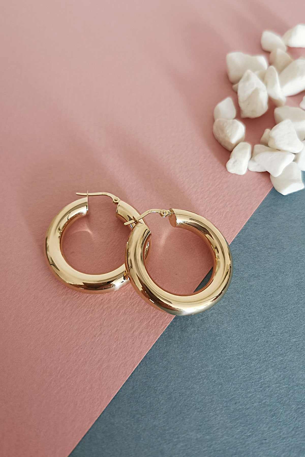 14 Ayar 3 Cm Boyunda 5.5 Gr Ağırlığında Sade, Spor Ve Dolgun Bir Duruşa Sahip, Günlük Kullanıma Uygun Altın Kalın 6 Mm Halka Küpe.