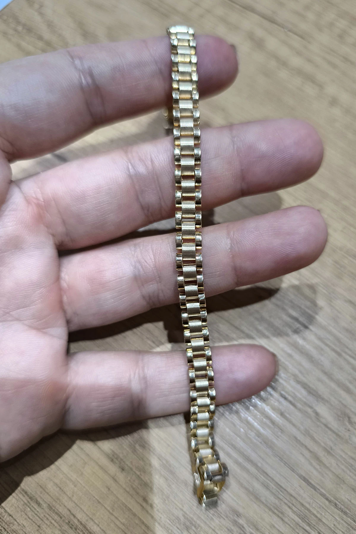 14 Ayar şık ve spor tasarım günlük kullanıma uygun taşsız geçme halka desenli model ışıl ışıl bir model 12.15 gram ağırlığında 6mm genişliğinde altın roleks erkek bileklik.