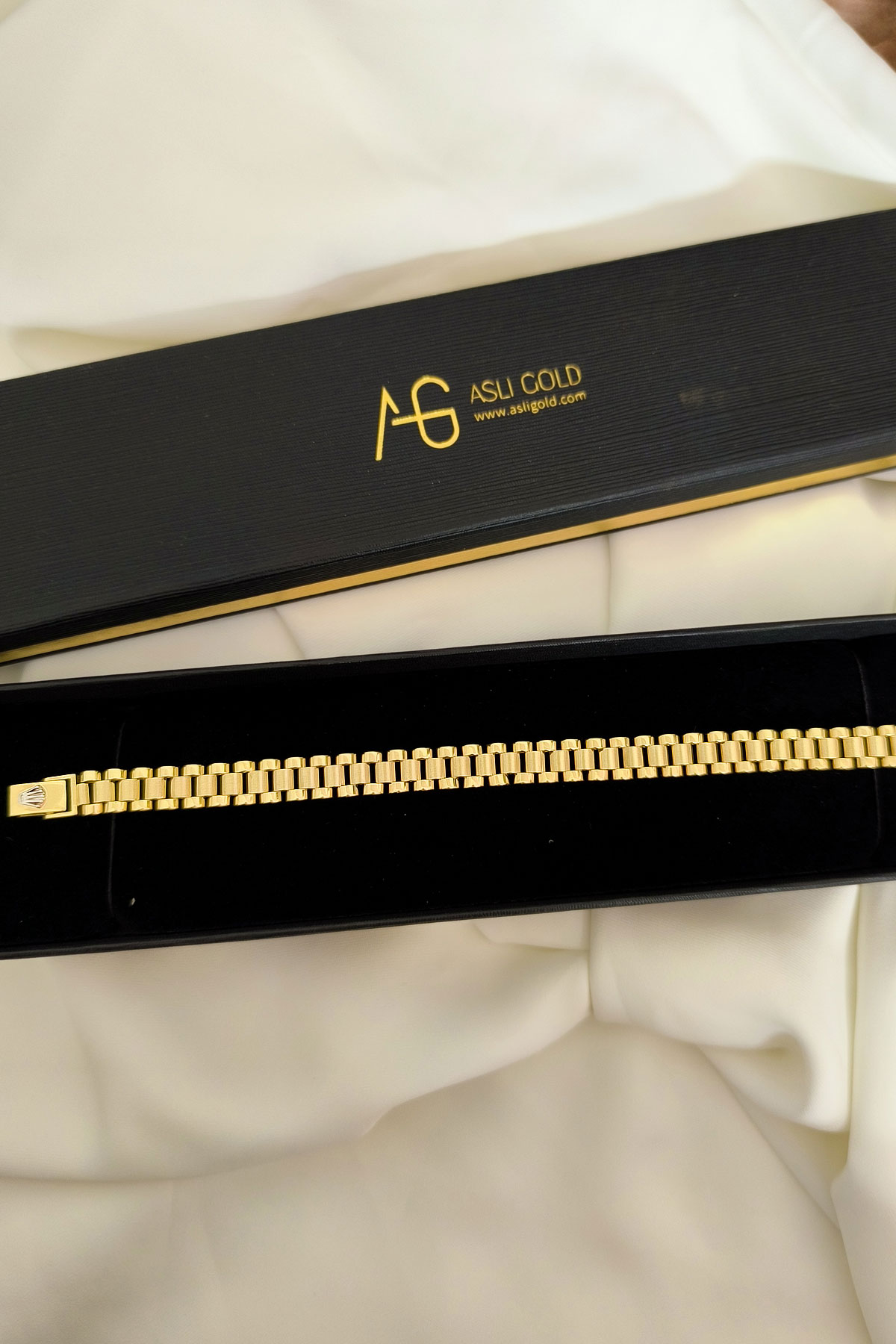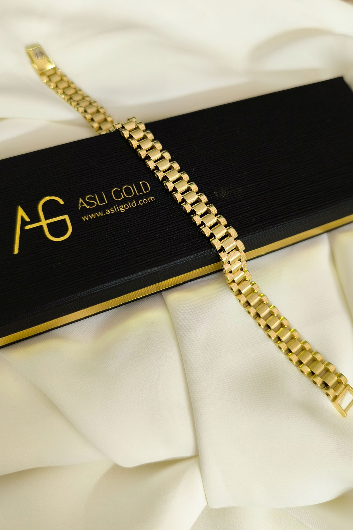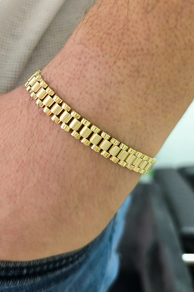 14 Ayar şık ve spor tasarım günlük kullanıma uygun taşsız geçme halka desenli model ışıl ışıl bir model 16.20 gram ağırlığında 8.5 mm genişliğinde altın roleks erkek bileklik.