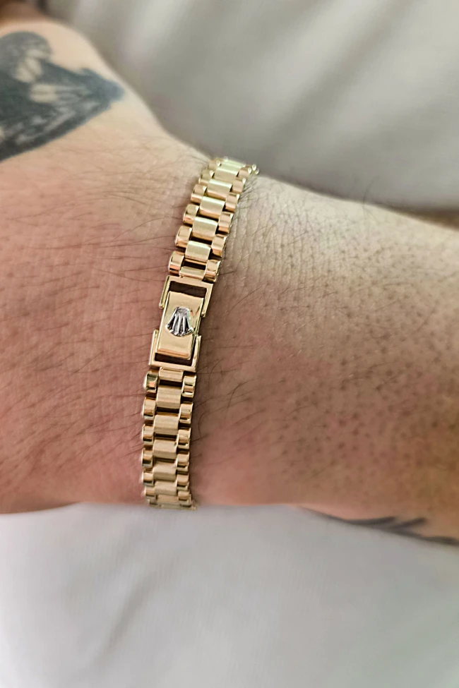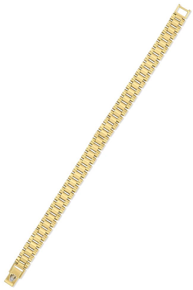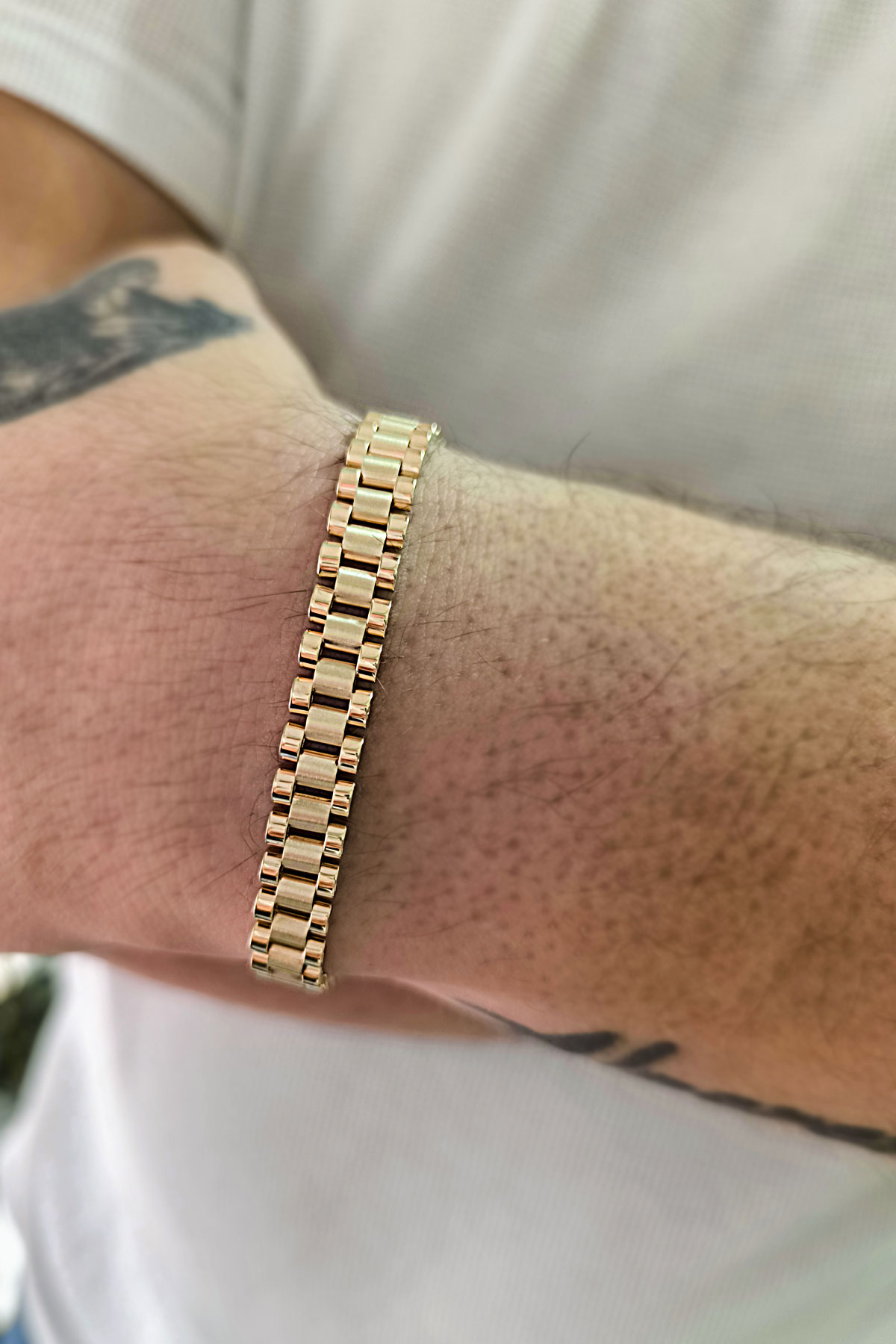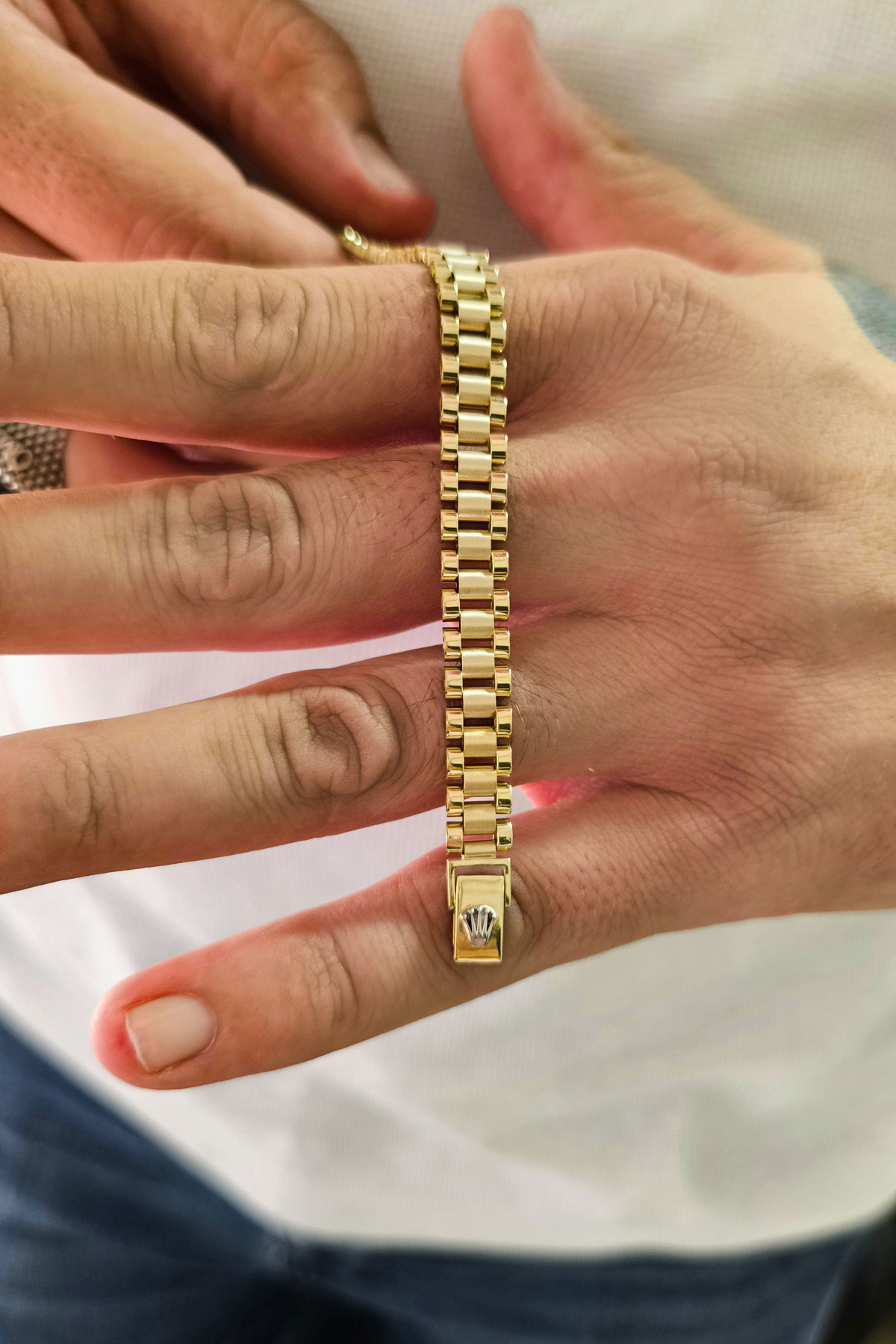 14 Ayar şık ve spor tasarım günlük kullanıma uygun taşsız geçme halka desenli model ışıl ışıl bir model 16.20 gram ağırlığında 8.5 mm genişliğinde altın roleks erkek bileklik.