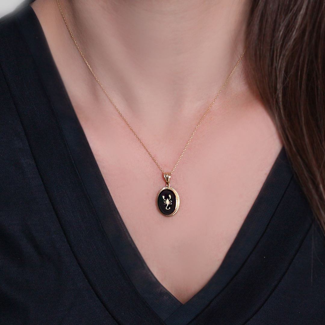 Siyah onix taş üzeri akrep kombinasyonu ile oldukça şık ve havalı bir duruşa sahip altın kolyeyle günlük stiline ışıltı katmaya hazır mısın?