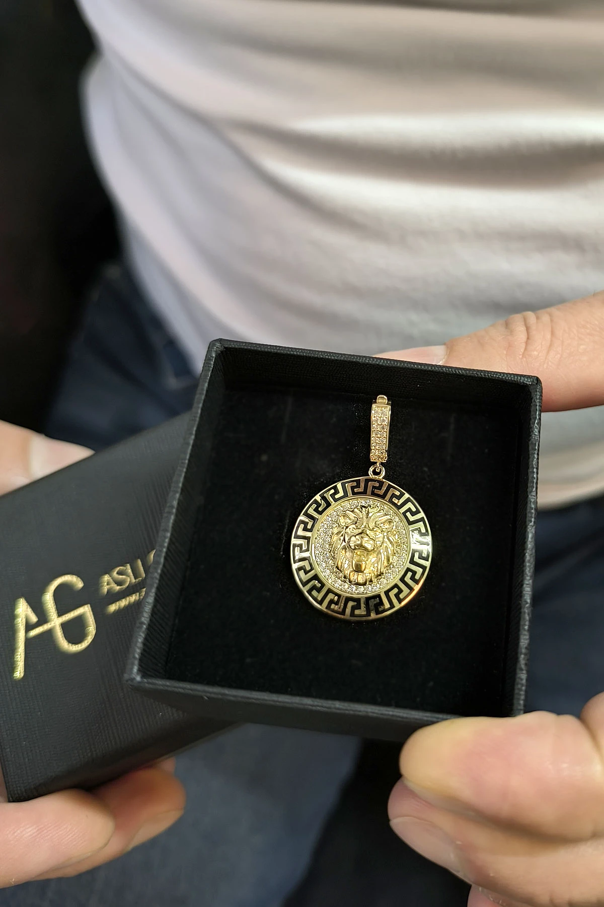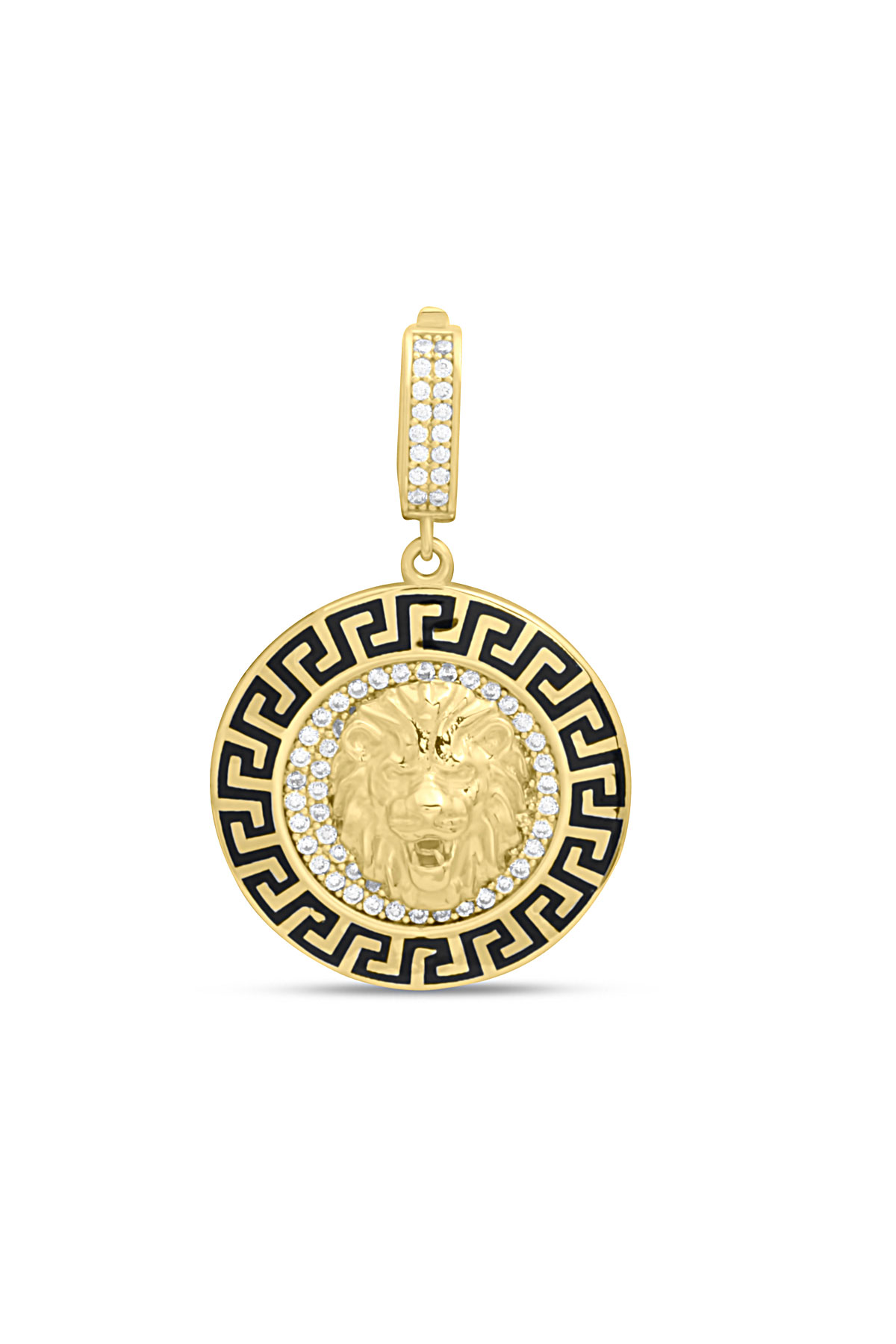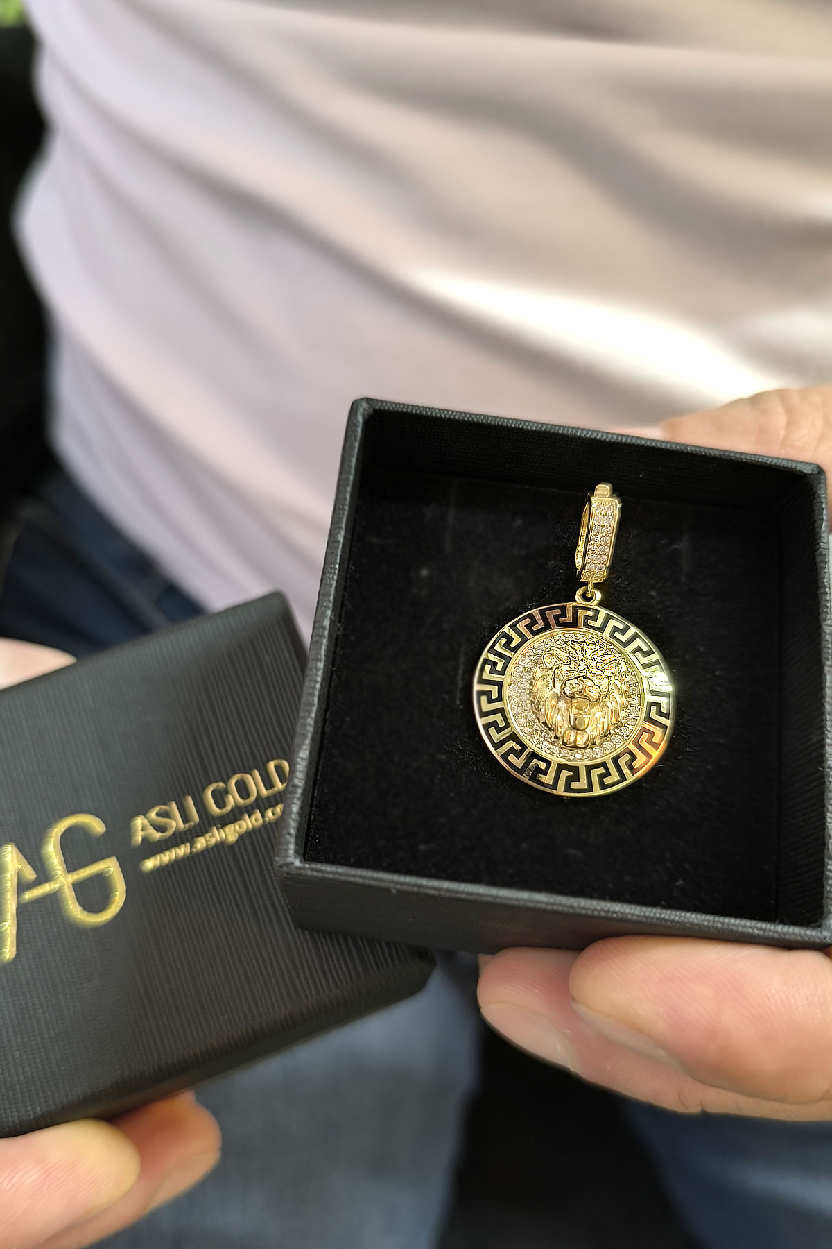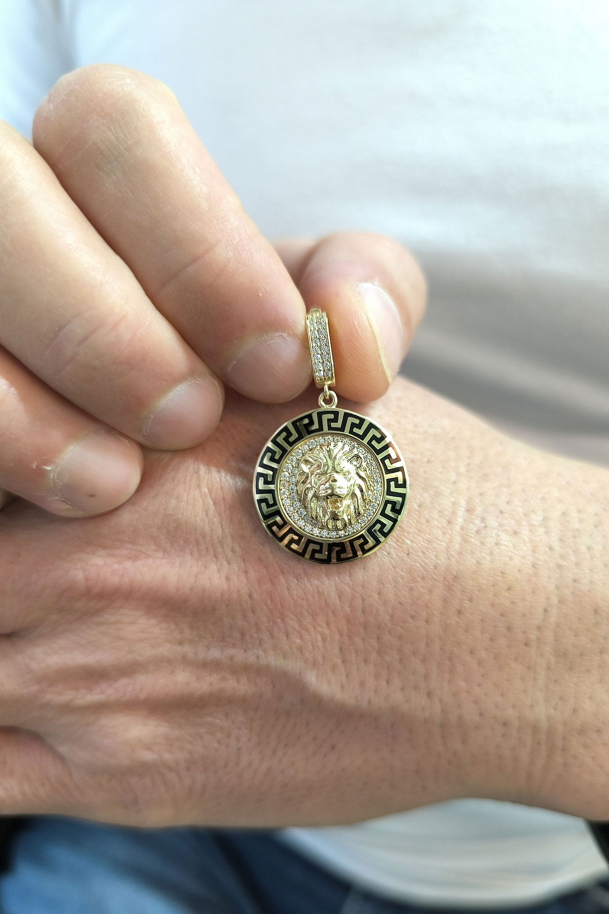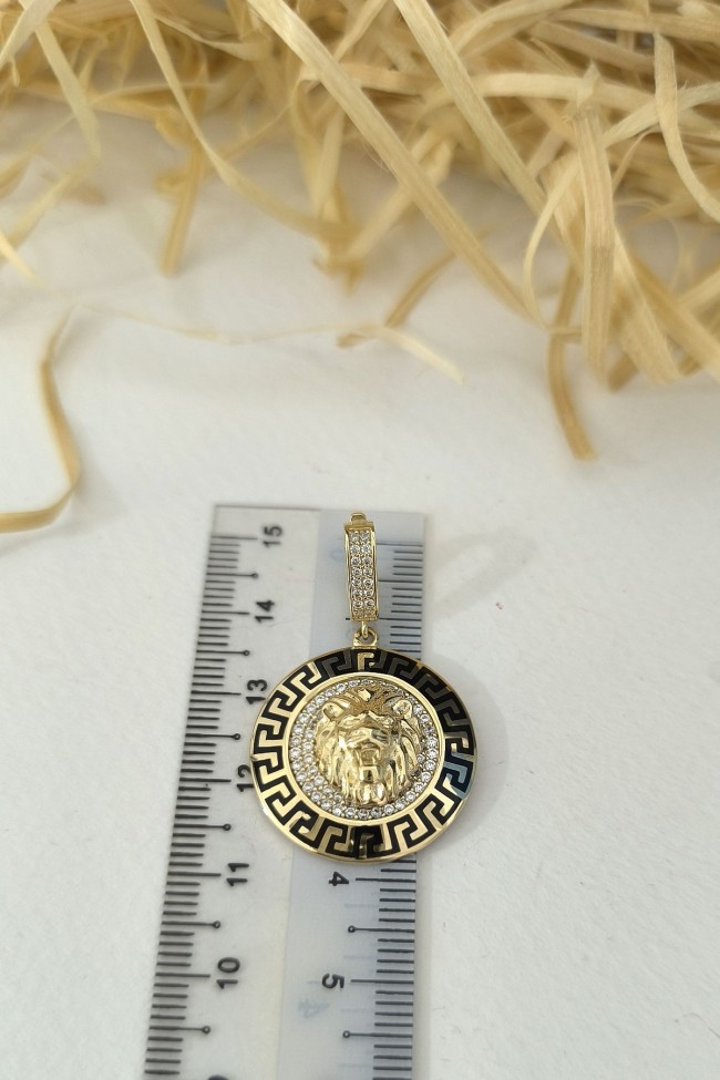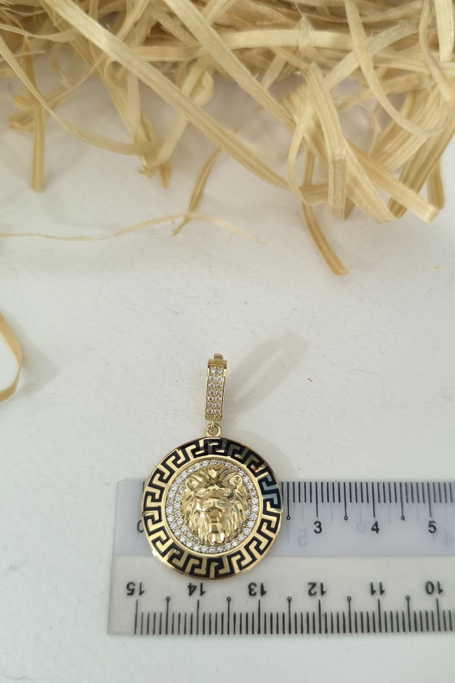Modern Şehirli Tarz Oldukça Şık Bir Modele Sahip Mineli Pana Kenar Detaylı Beyaz Mineli Taşlı 7.60 Gr. Ağırlığında 14 Ayar Altın Aslan Erkek Kolye Ucu.