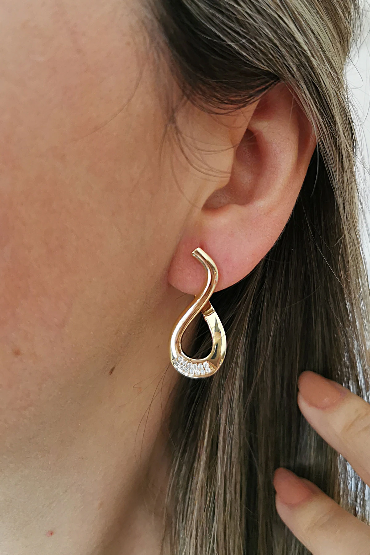 14 Ayar 3 cm modern, şık ve farklı tasarımı ile şahane modern bir duruşa da sahip günlük kullanıma uygun 5.30 gram ağırlığında kıvrımlı estetik S model az taşlı altın küpe.