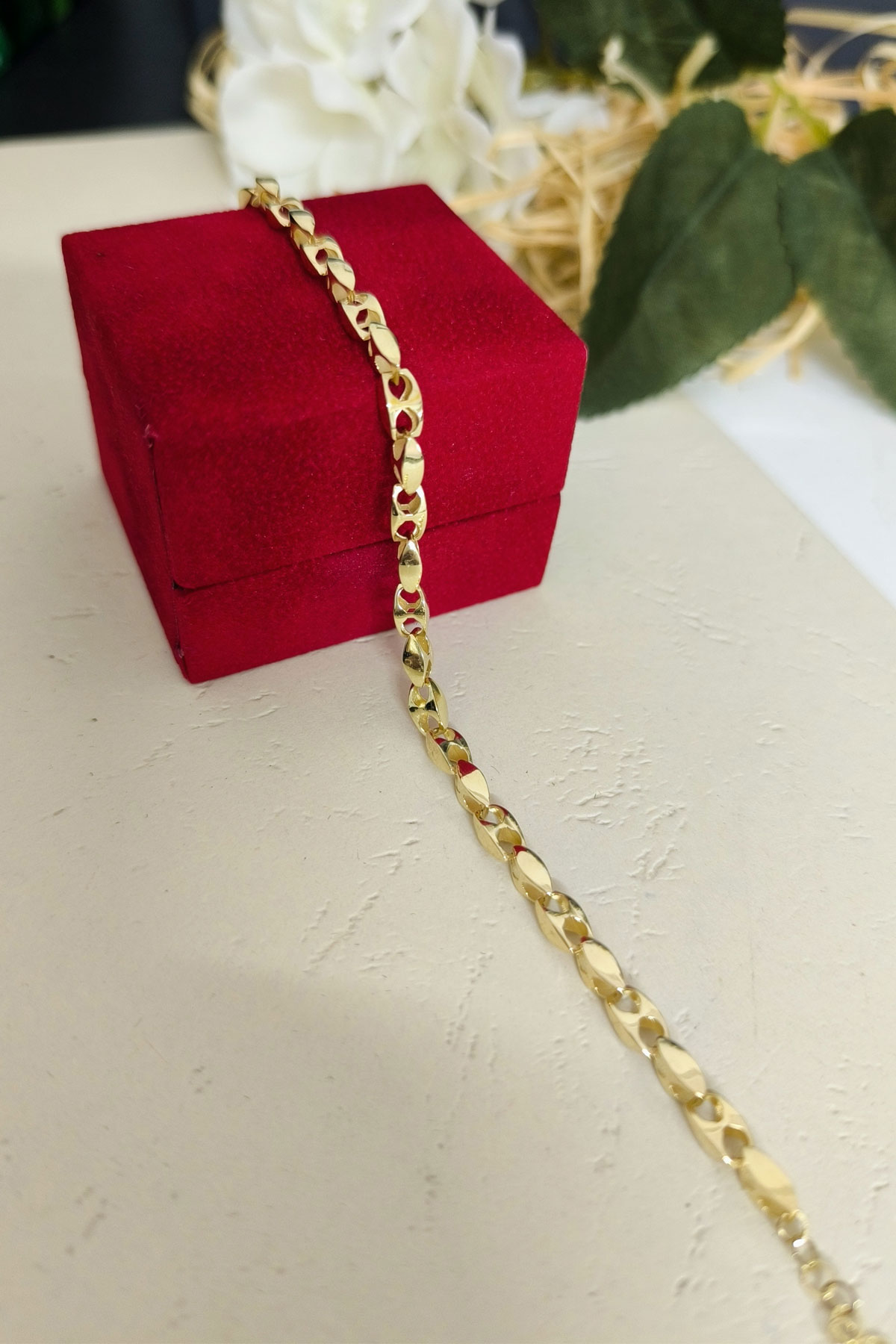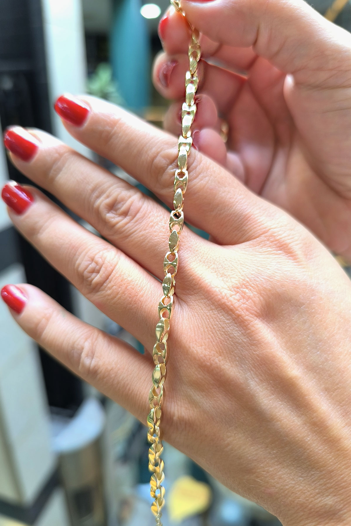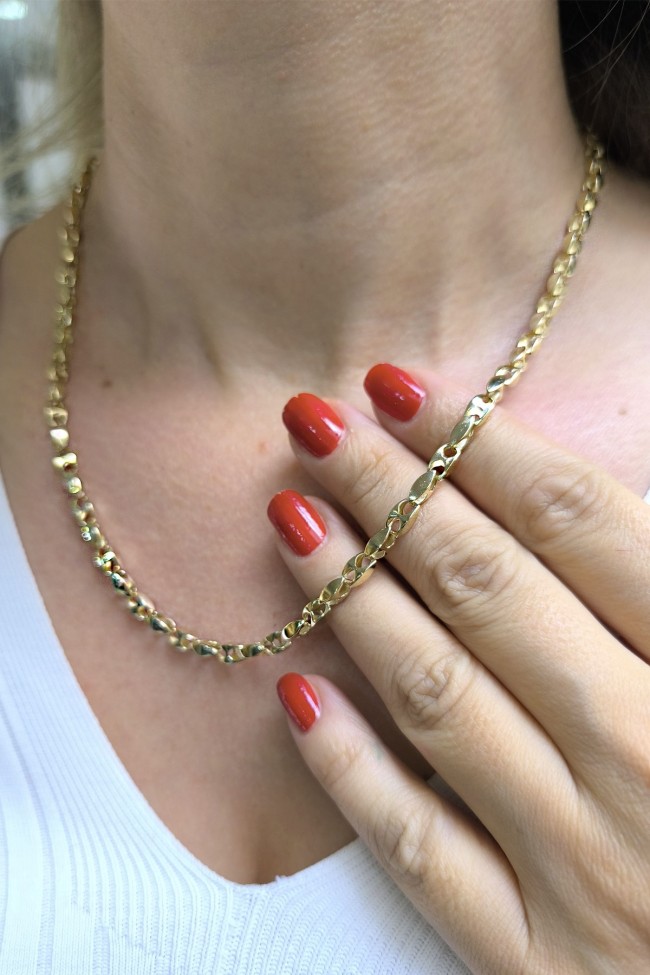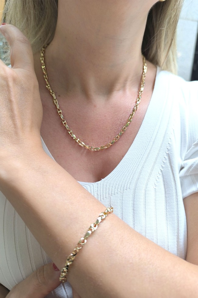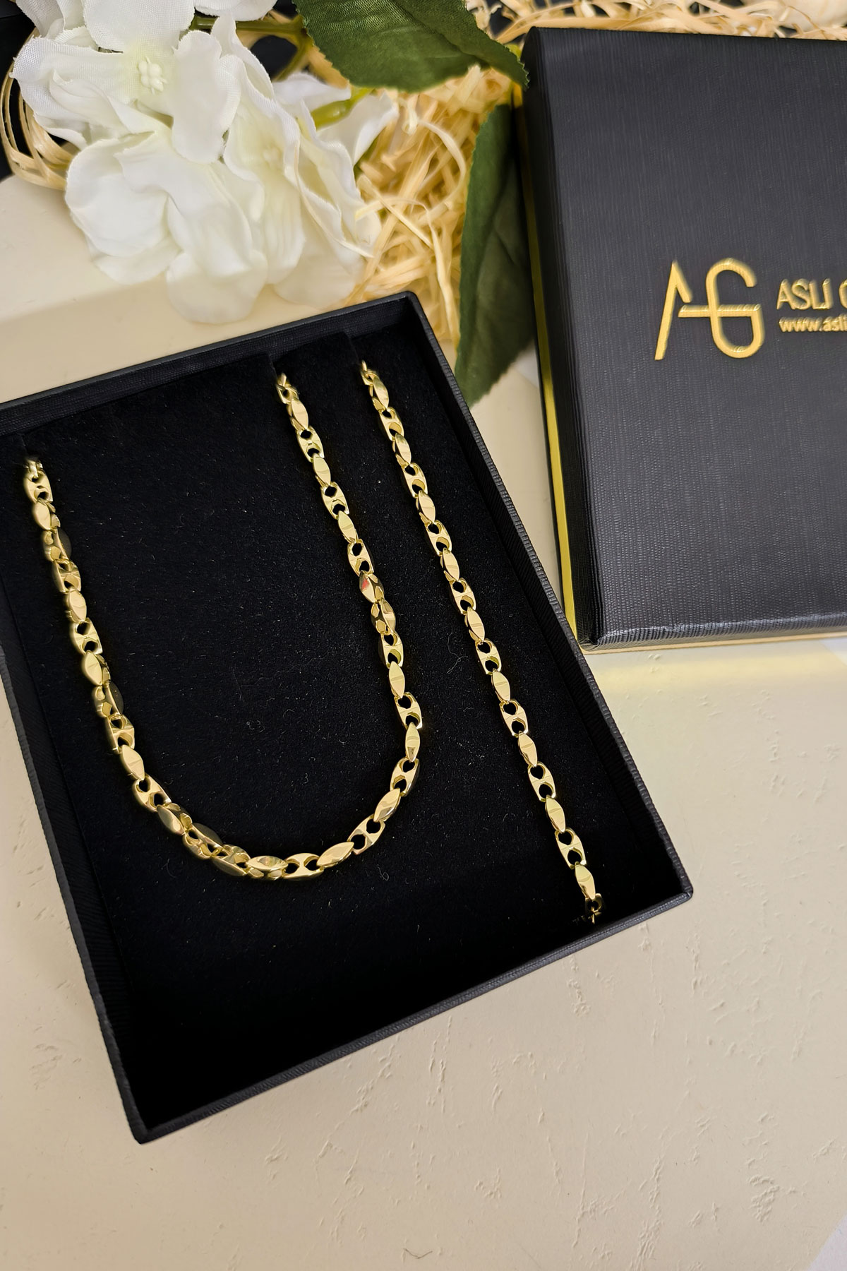 Spor tarz 19+2 Cm Boyunda Bileklik, 50+2 Cm Boyunda Kolyesi Olan Model 17.50 Gr. Ağırlığında 14 Ayar Altın, Şık Ve Modern, Günlük Kullanıma Uygun, Badem Gemici Tasarım Unisex Bileklik Kolye Set.