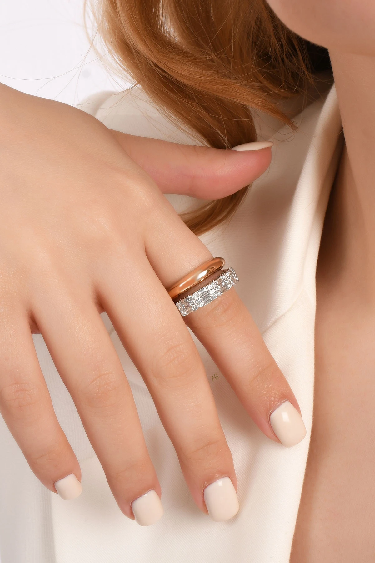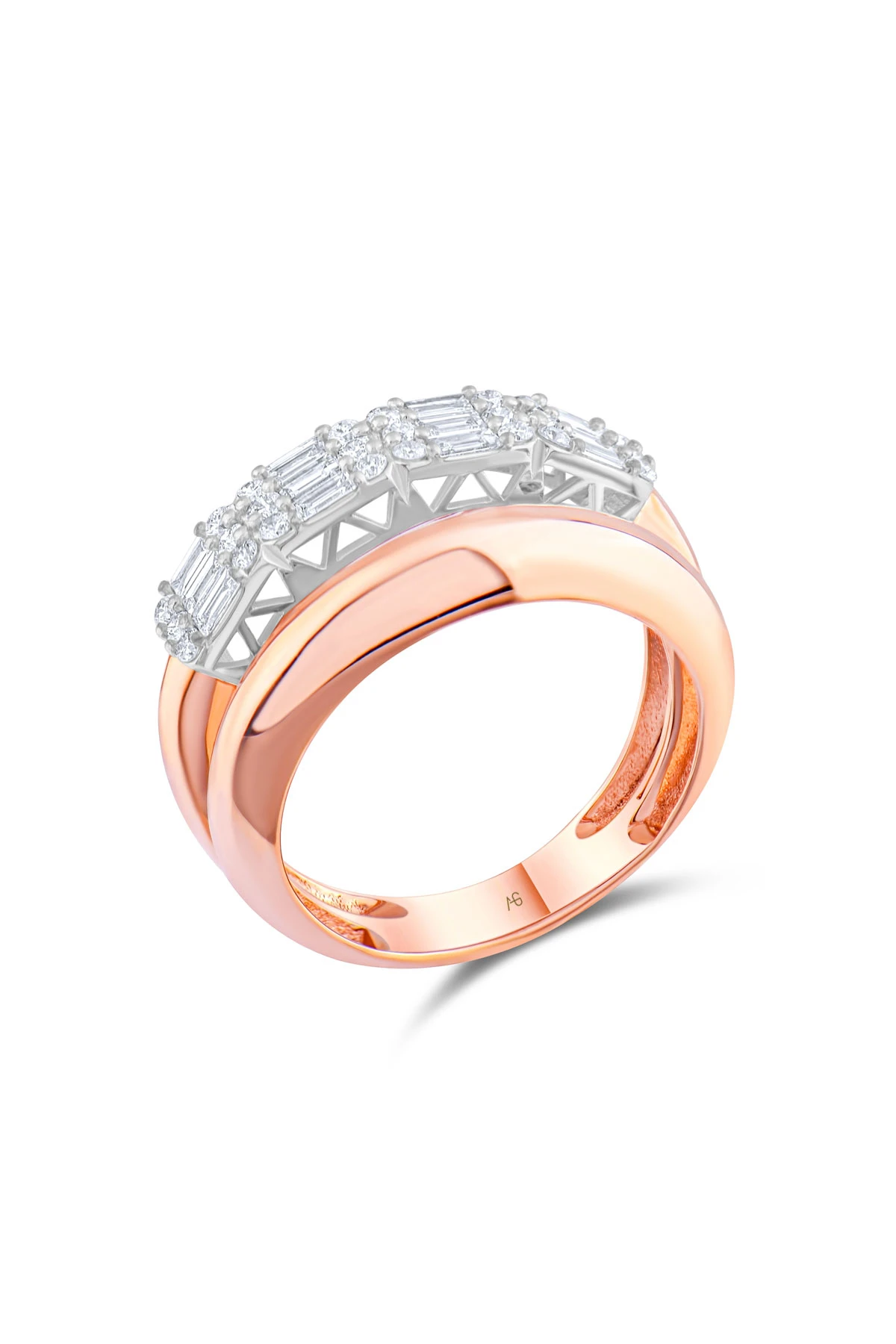 0.32 Ct. Daire, 0.54 Ct. F/VS-SI taş detaylarına sahip 18 ayar rose gold baget taşlı çiftli tasarım pırlanta yüzük.