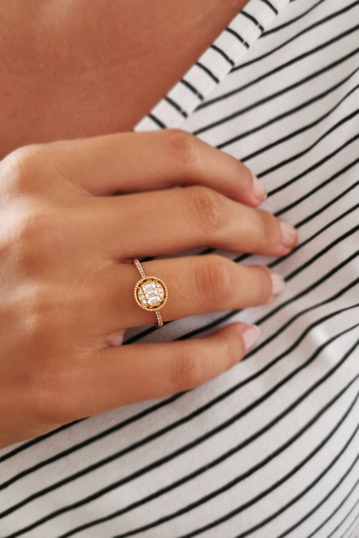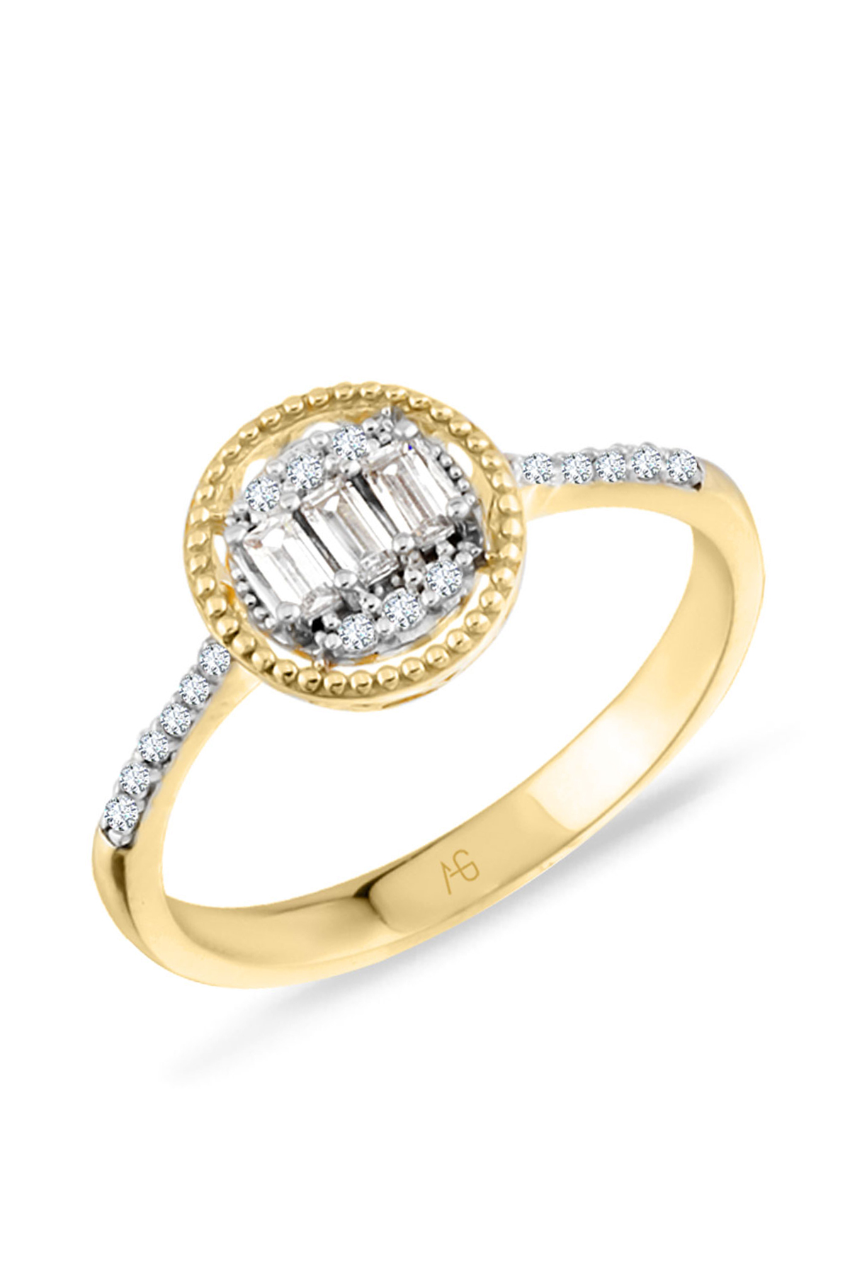 2.15 Gram Ağırlığında Yuvarlak Tasarımına Eşlik Eden Baget Taş Detaylı Günlük Kullanıma Uygun 14 Ayar Altın Sade Yüzük.