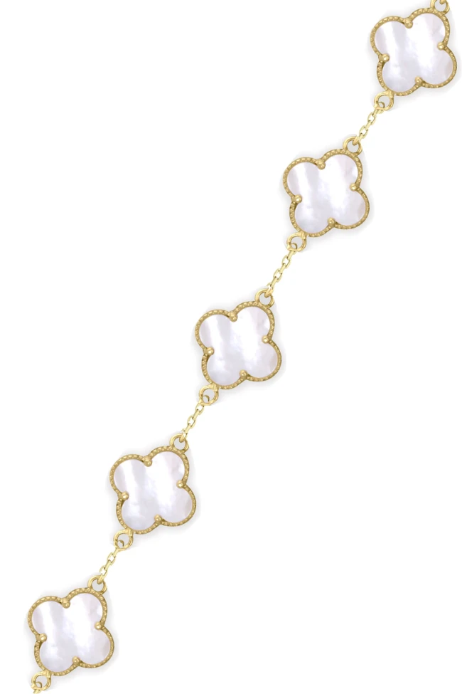 8.00 Gram Ağırlığında 18 +2 Cm Yonca Beyaz Sedef Taşlı Parçalardan Tasarlanmış Şık Bir Tarzı Olan 14 Ayar Altın Tasarım Bileklik.